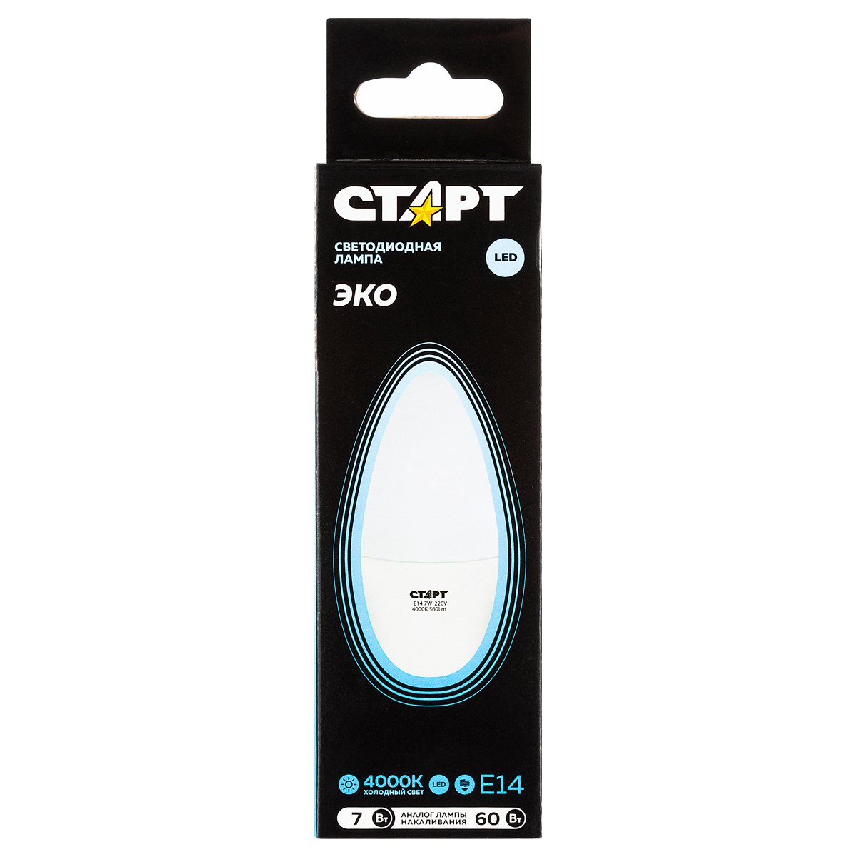Светодиодная лампа СТАРТ применяется для эффективной замены ламп накаливания в помещениях для основного или декоративного освещения. Подходит для большинства осветительных приборов, укомплектованных цоколем Е14. Свет от источника освещения ровный и теплый. Эстетика и удобство использования Плафон лампы выполнен в форме свечи и может выступать дополнительным элементом для декорирования. Конструкция лампы герметична, ее работа не зависит от температурных изменений. Свет от лампы на уровне 4000К — естественный белый, приятный для глаз. Экономия Низкое энергопотребление лампы на уровне 7Вт соответствует 60Вт от стандартной лампы накаливания. Использование светодиодов обеспечивает экономию по энергозатратам до 90% по сравнению с обычными аналогами. Срок службы элемента освещения составляет 25 000 часов. Безопасность Встроенные микроконтроллеры исключают перегрев лампы и замыкание вследствие перепадов напряжения. Корпус изготовлен из нетоксичных материалов, соответствующих стандартам по использованию данного типа ламп в жилых помещениях. Утилизация и переработка элемента освещения не наносит ущерба окружающей среде.