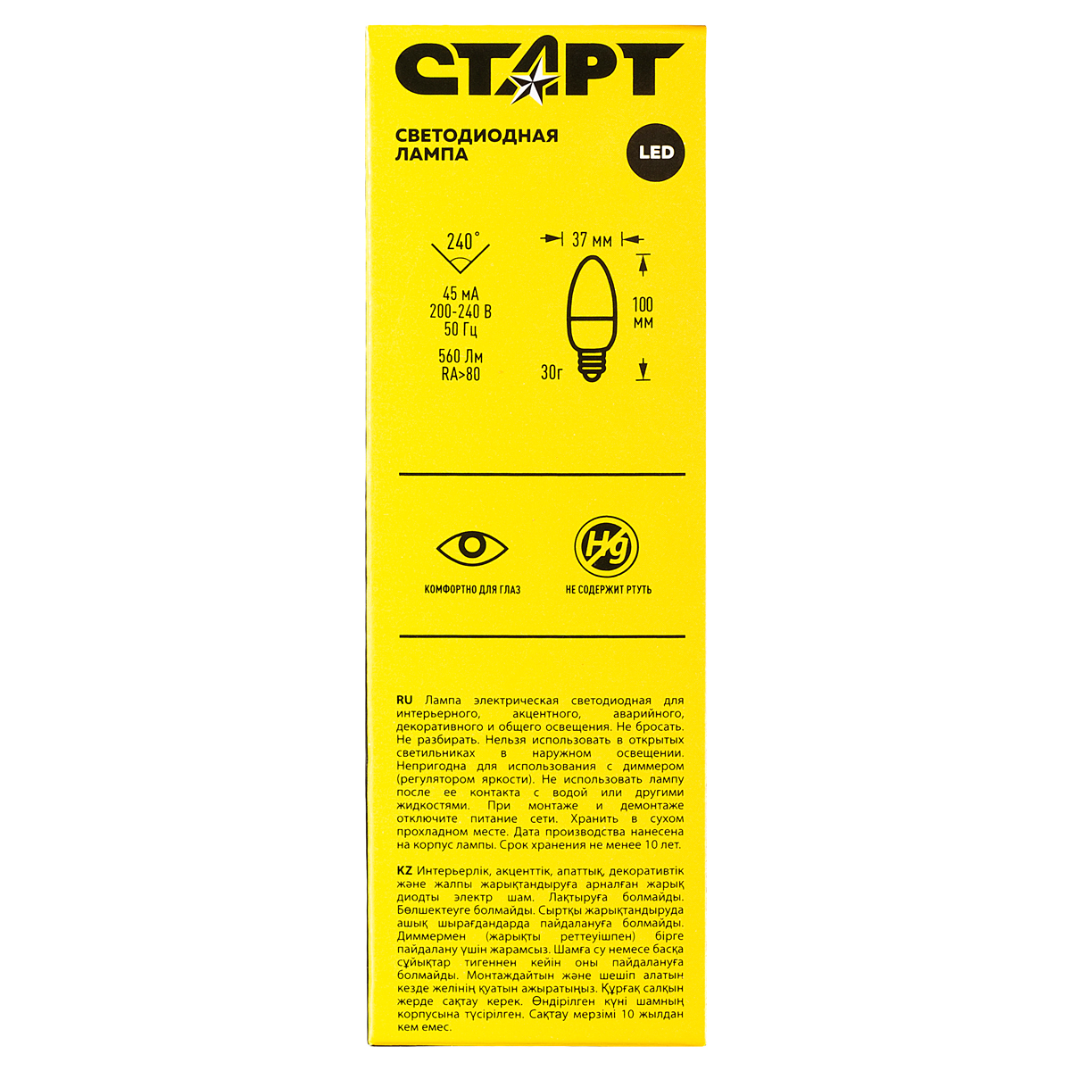 Светодиодная лампа СТАРТ – оптимальный источник основного или локального освещения в помещениях. Также подходит для декорирования и создания световых зон.Низкое энергопотребление, срок службы и надежность— главные преимущества светодиодных ламп. Эстетика и удобство использования Лампа выполнена в форме свечи и подходит к любым люстрам, настенным светильниками ночникам с цоколем Е14. Благодаря встроенной защите лампа не чувствительна к перепадам напряжения. Герметичность плафона позволяет использовать осветительный прибор в условиях температурных перепадов и повышенной влажности. Цвет свечения –теплый, комфортный для глаз. Экономия Использование светодиодной лампы СТАРТ на 90% экономичнее по сравнению с традиционными лампами накаливания. Срок службы составляет 25 000 часов. Повсеместное использование светодиодных ламп в жилом или коммерческом помещении позволяет значительно снизить расходы на электроэнергию. Безопасность Использование ламп в домашних условиях соответствует правилам и нормам безопасности. Лампа не перегревается и может быть использована в спальнях и детских комнатах. Элемент освещения произведен из экологически чистых материалов и по окончанию срока эксплуатации лампа может быть утилизирована без специальных условий.