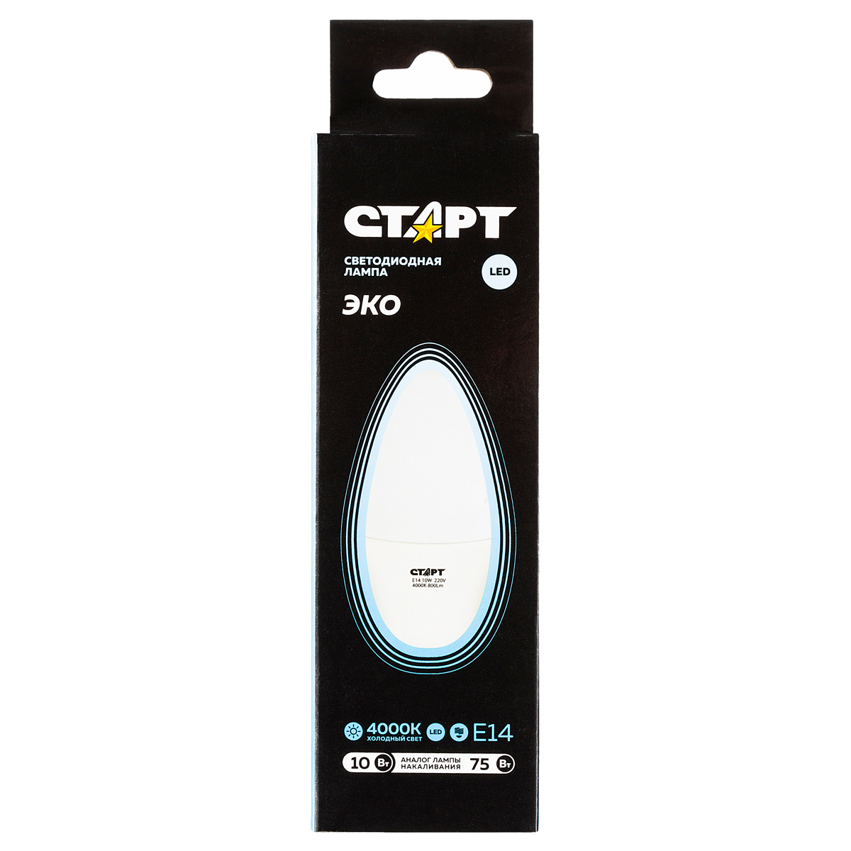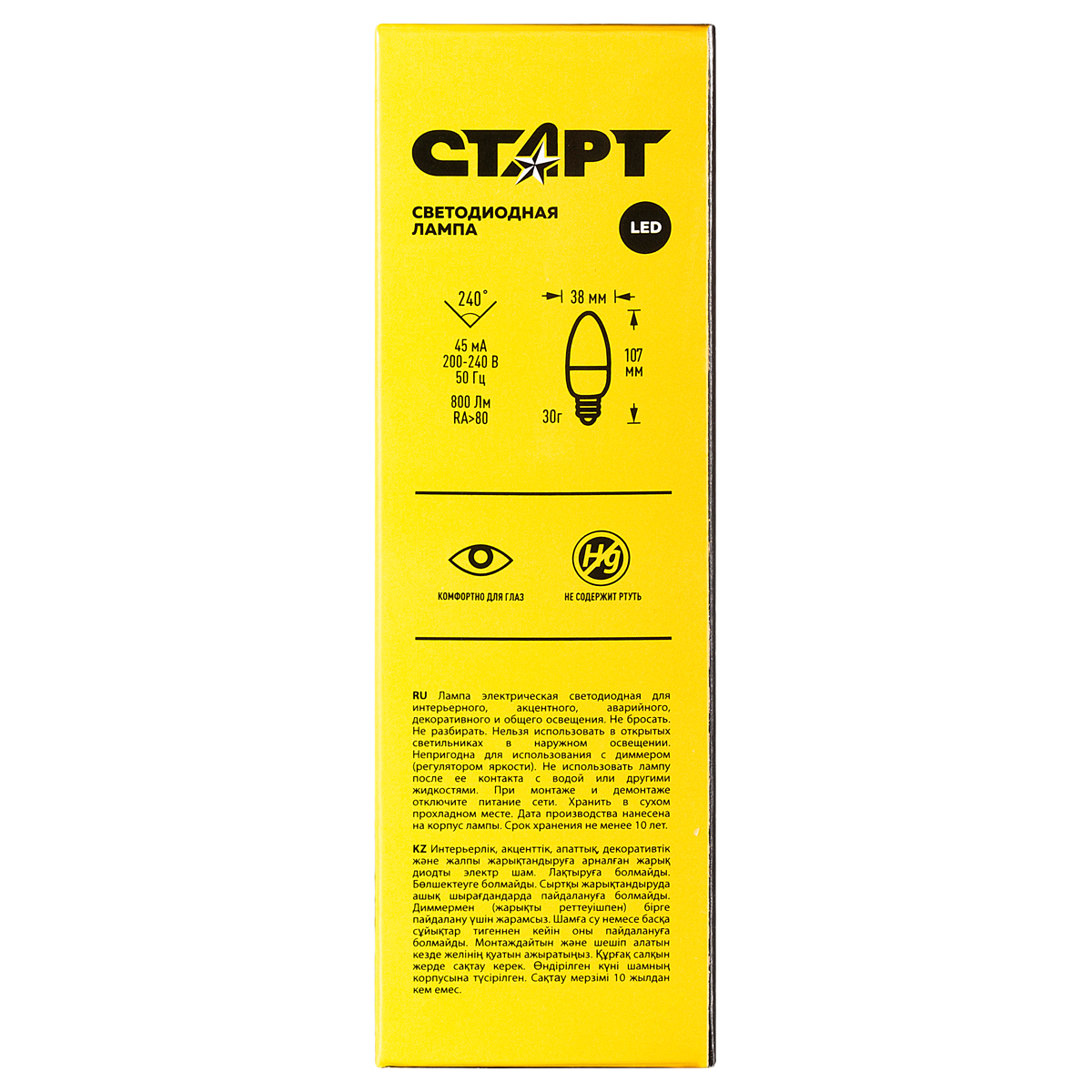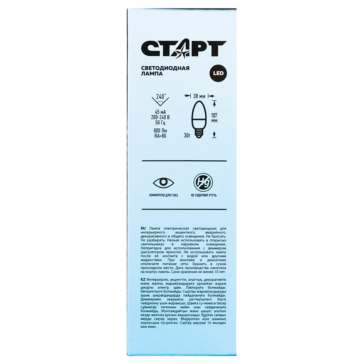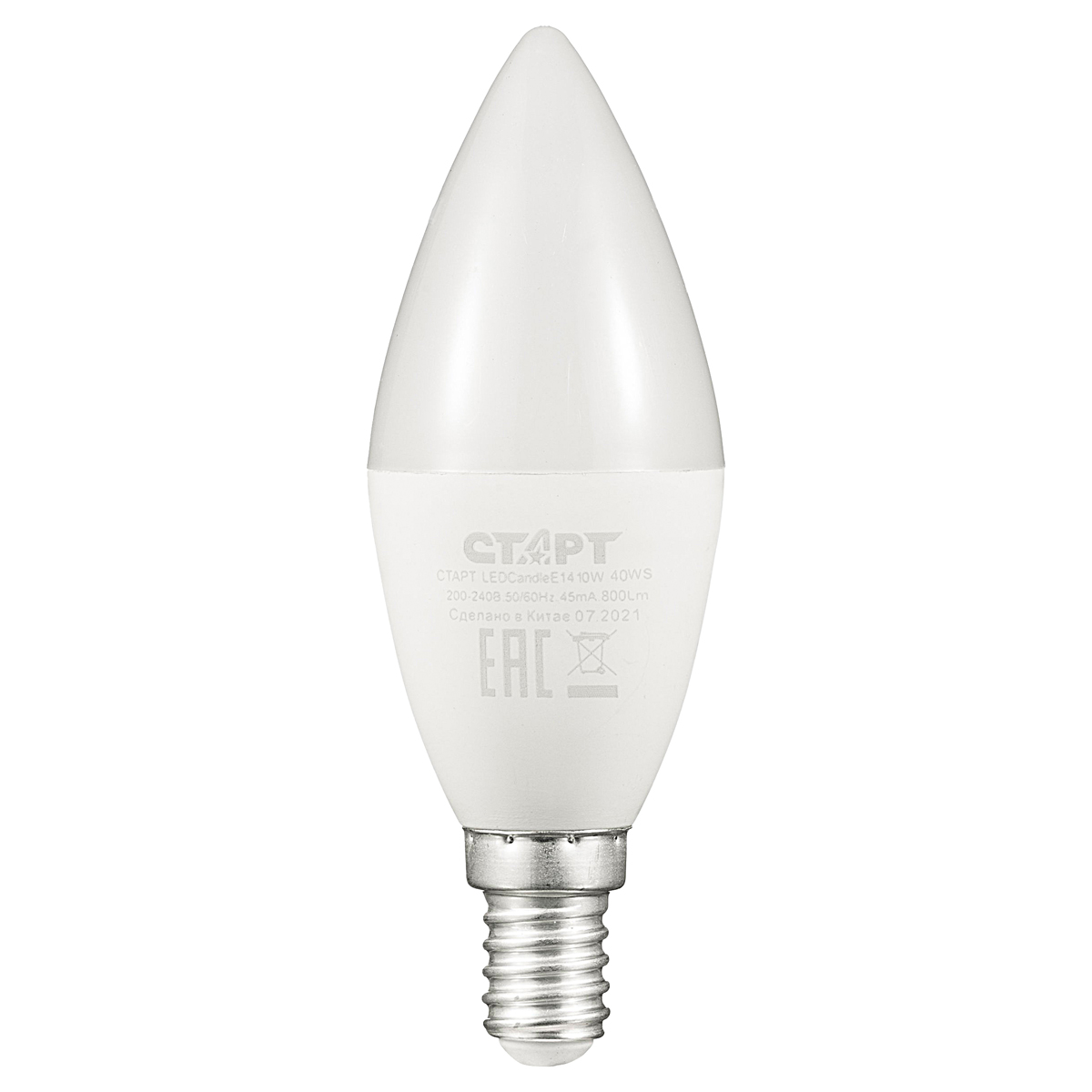 Светодиодная лампа СТАРТ – оптимальный источник основного или локального освещения в помещениях. Также подходит для декорирования и создания световых зон.Низкое энергопотребление, срок службы и надежность— главные преимущества светодиодных ламп. Эстетика и удобство использования Лампа выполнена в форме свечи и подходит к любым люстрам, настенным светильниками ночникам с цоколем Е14. Благодаря встроенной защите лампа не чувствительна к перепадам напряжения. Герметичность плафона позволяет использовать осветительный прибор в условиях температурных перепадов и повышенной влажности. Цвет свечения –холодный, комфортный для глаз. Экономия Использование светодиодной лампы СТАРТ на 90% экономичнее по сравнению с традиционными лампами накаливания. Срок службы составляет 25 000 часов. Повсеместное использование светодиодных ламп в жилом или коммерческом помещении позволяет значительно снизить расходы на электроэнергию. Безопасность Использование ламп в домашних условиях соответствует правилам и нормам безопасности. Лампа не перегревается и может быть использована в спальнях и детских комнатах. Элемент освещения произведен из экологически чистых материалов и по окончанию срока эксплуатации лампа может быть утилизирована без специальных условий.