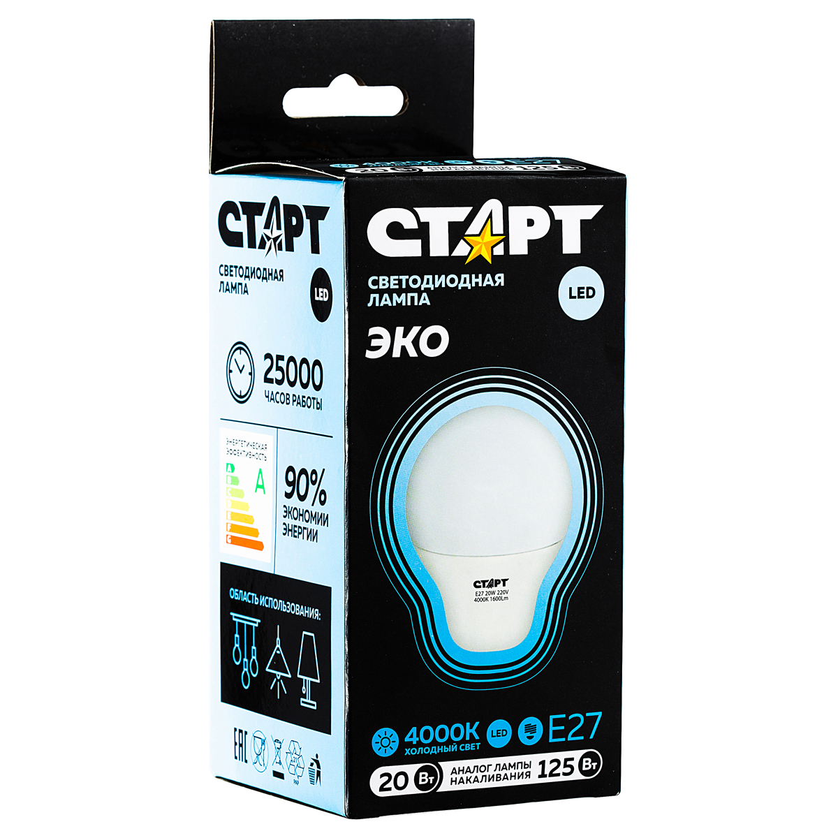 Светодиодная лампа СТАРТиспользуется для освещения различных помещений и является наиболее эффективной лампой среди цокольных аналогов. Благодаря герметичности она может быть использована в качестве источника света в уличныхосветительных приборах. Рассчитана на мощное освещение при низких энергозатратах. Эстетика и удобство использования Лампа комплектуется пластиковой колбой и не боится падения и встрясок. Водонепроницаемость корпуса позволяет использовать данный источник света в помещениях с повышенной влажностью и различными температурными показателями. Матовый рассеиватель дает равномерное покрытие освещаемой площади, заполняя пространство естественным белым светом на уровне 4000К. Экономия Элемент освещения способен бесперебойно работать на протяжении рекордных 25 000 часов. Лампа соответствует аналогам мощностью 125Вт, при этом мощность самой светодиодной лампы составляет 20 Вт.Низкое энергопотребление и высокие показатели эффективности делают лампу экономичным источником света. Безопасность Корпус произведен из экологически чистых материалов, безопасен для эксплуатации в жилых помещениях. Светодиодный источник освещения оборудован защитой от перегрева и перепадов напряжения. Лампа не излучает УФ- и ИК-лучи в процессе свечения.
