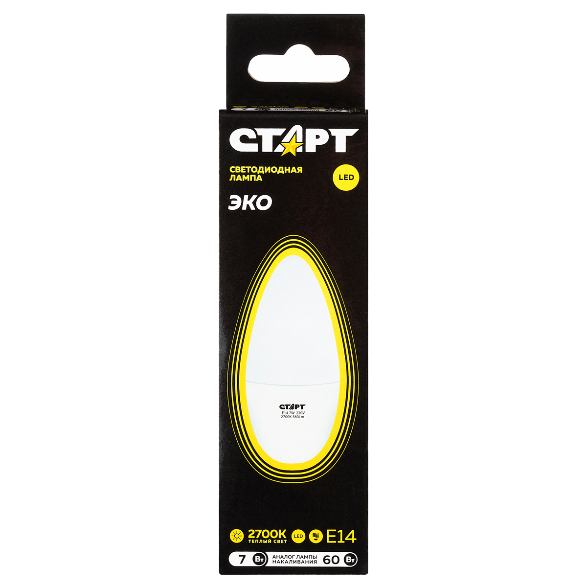 Светодиодная лампа СТАРТ используется в бытовых помещениях для обеспечения основного либо декоративного освещения. Эффективно заменяет лампы накаливания, галогеновые лампы в светильниках любой конфигурации, использующих цоколь Е14. Лампа дает ровный комфортный свет, оптимальный для восприятия человеческим глазом. Эстетика и удобство использования Элемент освещения выполнен в форме свечи, что позволяет дополнительно декорировать стильные люстры, настенные светильники. Встроенная защита делает лампу нечувствительной к перепадам напряжения. Конструкция плафона герметична и предохраняет от повышенной влажности и температурных изменений окружающей среды. Матовая колба в качестверассеивателя передает ровное освещение, наполняя помещение теплым белым светом на уровне 2700К. Экономия Конструкция лампы обеспечивает экономию при энергопотреблении до 90% по сравнению с обыкновенными лампами накаливания. При этом заявленный срок службы осветительного элемента составляет до 25000 рабочих часов. Энергопотребление светодиодной лампы 7Вт, что соответствует 60Вт по сравнению с лампами накаливания. Безопасность Свет, передаваемый лампой, не имеет посторонних эффектов и комфортно воспринимается человеческим глазом. Материалы, из которых произведен элемент освещения, не содержат вредных веществ. Колба не подвержена избыточному нагреву, поэтому является безопасной для использования в детских комнатах, спальнях. По окончанию срока эксплуатации лампа может быть утилизирована и переработана.