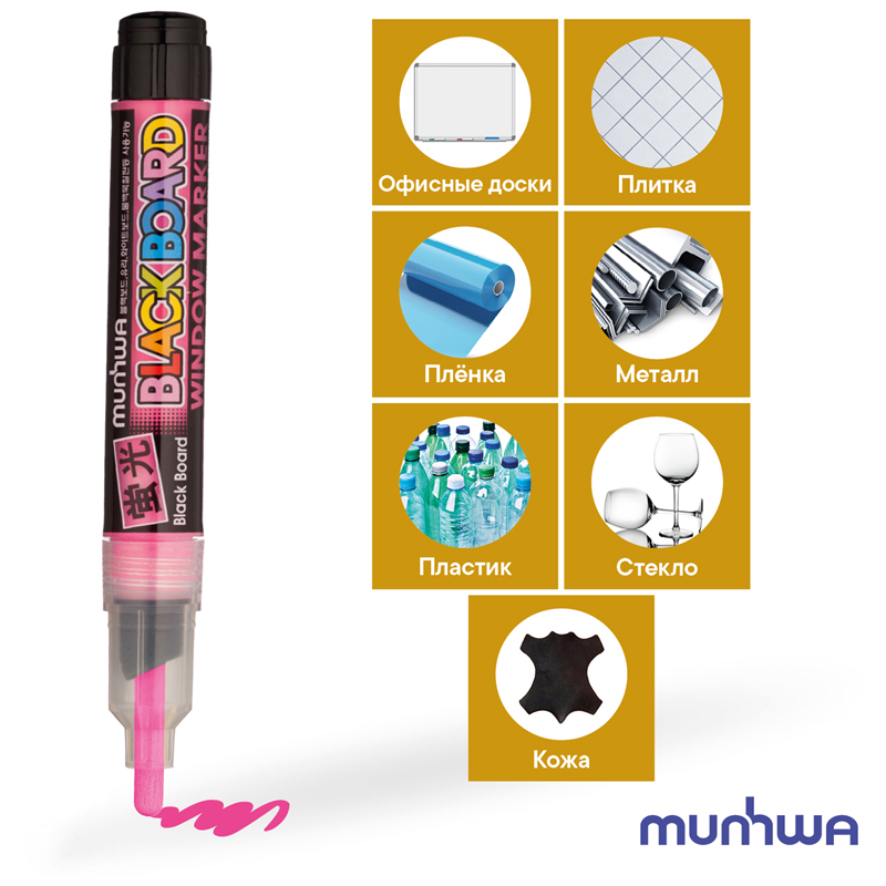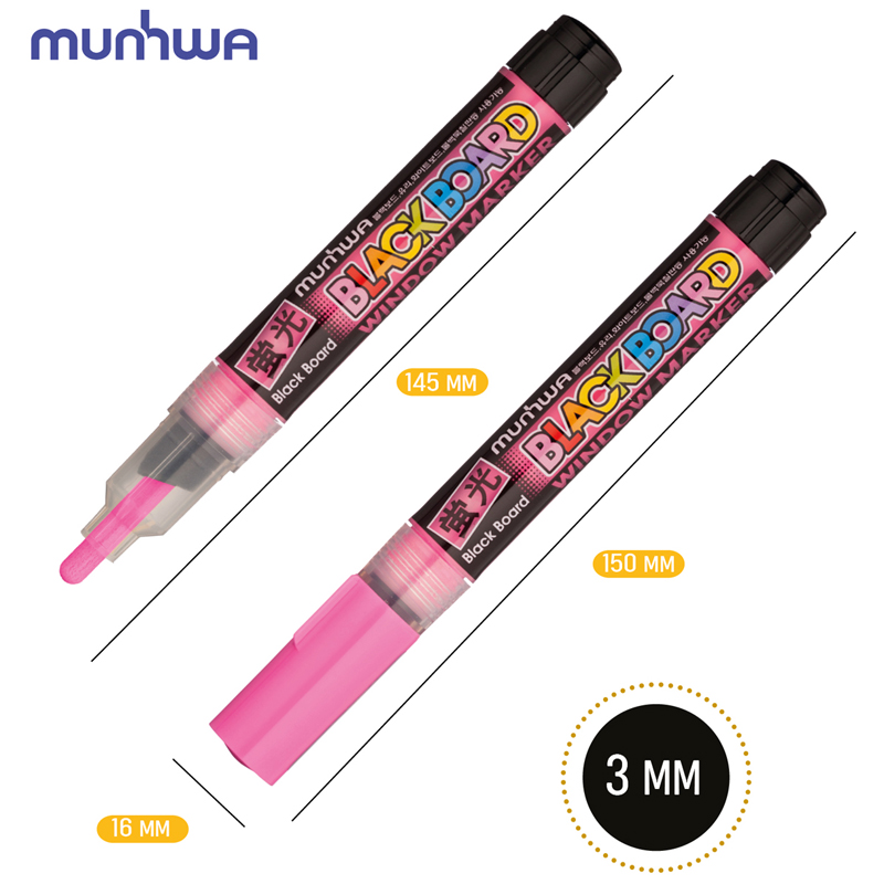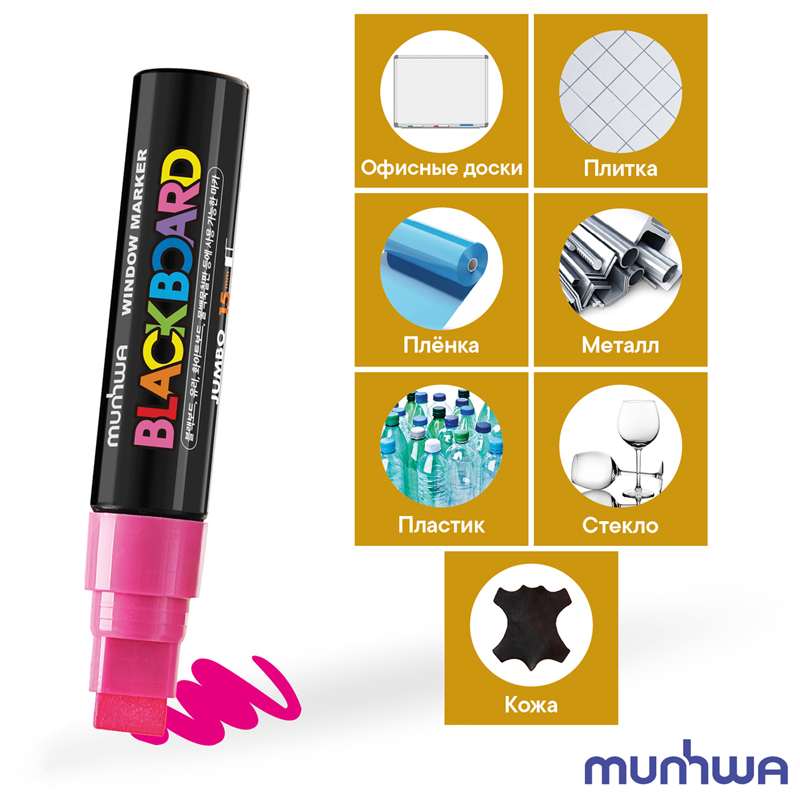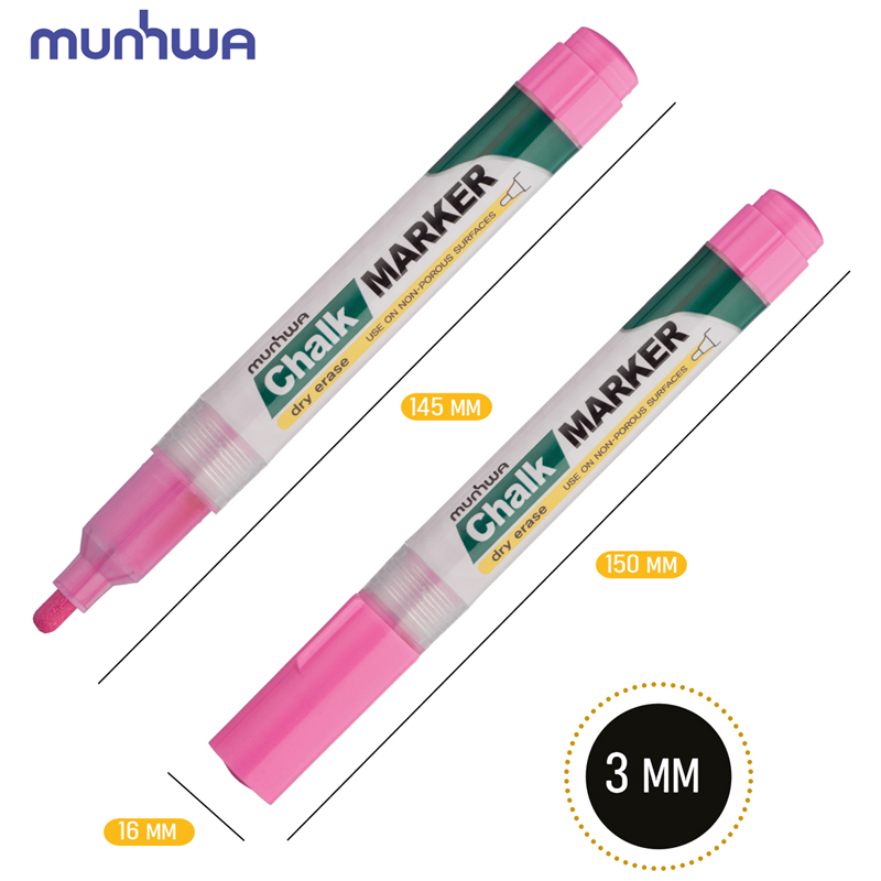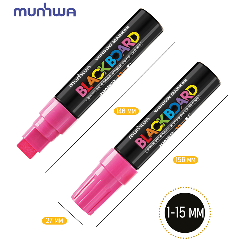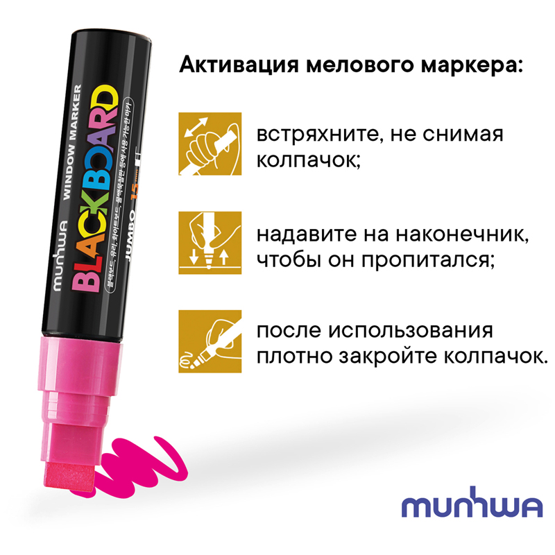 Маркер меловой MunHwa "Black Board Jumbo" - жидкий мел на водной основе. Используется для письма на белой и черной доске, для декорирования зеркал и стекол, оформления окон, для надписей на металле и коже, идеальный инструмент для детского творчества. Маркеры, нанесенные на гладкую поверхность, легко удаляются влажной тканью. Благодаря высококачественным чернилам, мел поступает дозированно, ложится на поверхность равномерным и однородным слоем, полностью закрашивая обрабатываемую поверхность. Меловой маркер - не крошится, не осыпается при нанесении и не пачкает руки. Клапанный механизм пишущего узла исключает растекание и разбрызгивание мела, преждевременное пересыхание маркера. Благодаря прямоугольному пишущему узлу толщину линии письма можно варьировать от 1 до 15 мм. Вдвое увеличенный запас чернил. Яркий неоновый розовый цвет чернил. Меловой маркер MunHwa "Black Board Jumbo" - это твой помощник для воплощения всех креативных решений в жизнь. Инструкция по применению: 1) Встряхнуть м