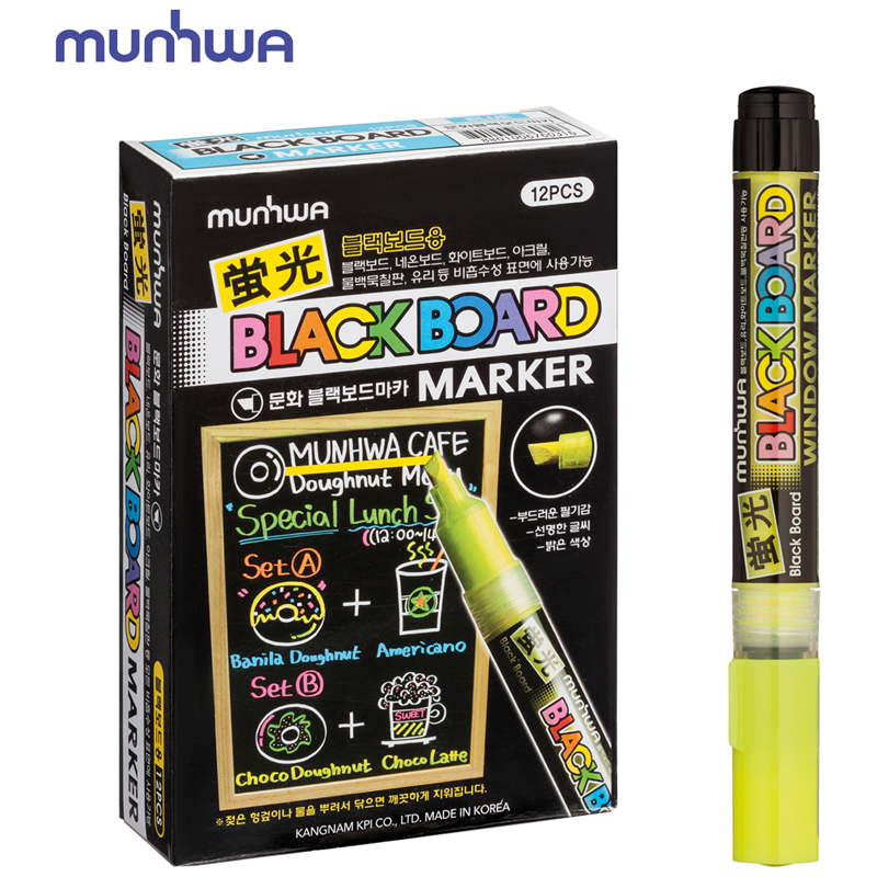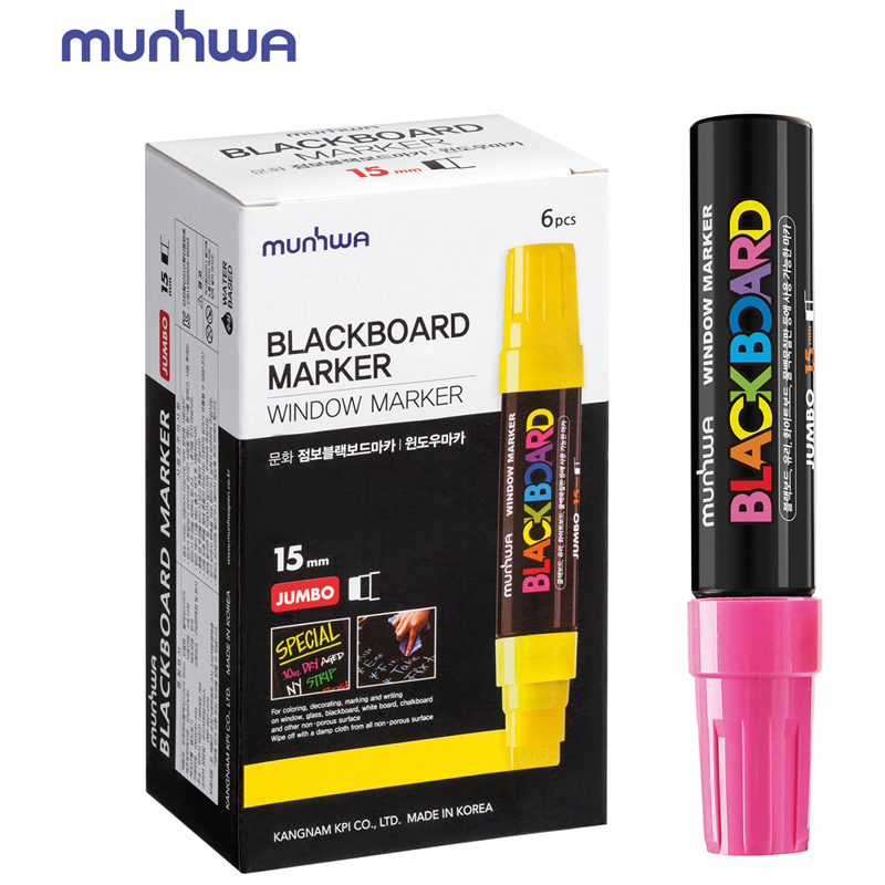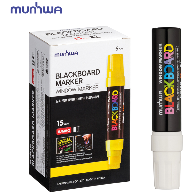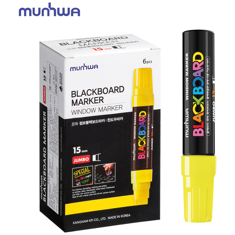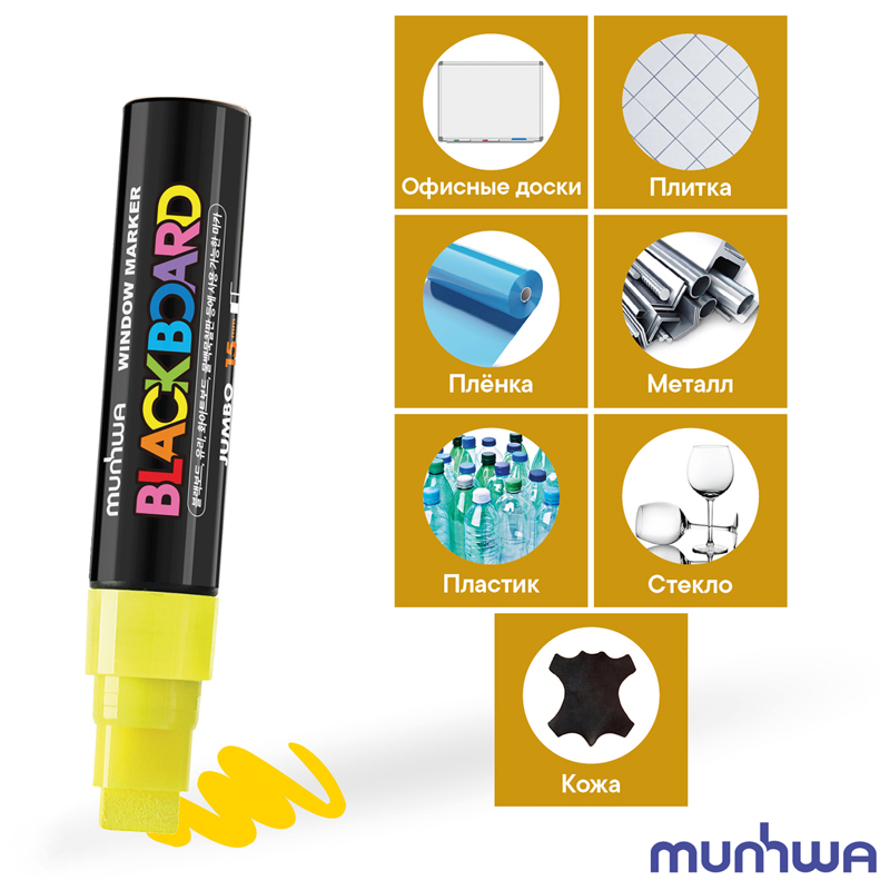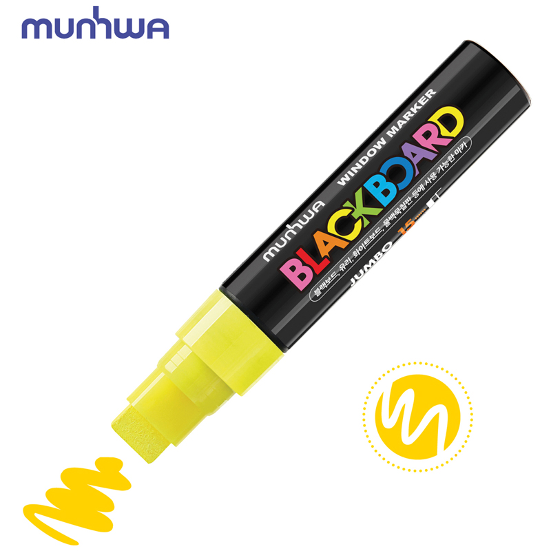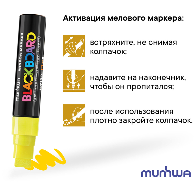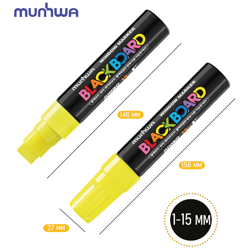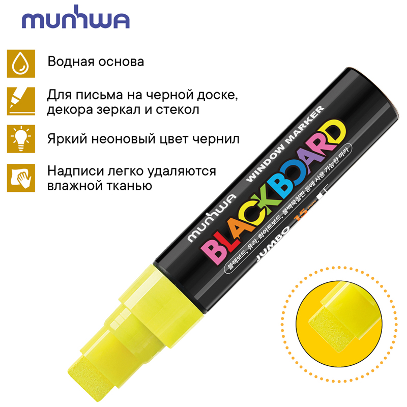 Маркер меловой MunHwa "Black Board Jumbo" - жидкий мел на водной основе. Используется для письма на белой и черной доске, для декорирования зеркал и стекол, оформления окон, для надписей на металле и коже, идеальный инструмент для детского творчества. Маркеры, нанесенные на гладкую поверхность, легко удаляются влажной тканью. Благодаря высококачественным чернилам, мел поступает дозированно, ложится на поверхность равномерным и однородным слоем, полностью закрашивая обрабатываемую поверхность. Меловой маркер - не крошится, не осыпается при нанесении и не пачкает руки. Клапанный механизм пишущего узла исключает растекание и разбрызгивание мела, преждевременное пересыхание маркера. Благодаря прямоугольному пишущему узлу толщину линии письма можно варьировать от 1 до 15 мм. Вдвое увеличенный запас чернил. Яркий неоновый желтый цвет чернил. Меловой маркер MunHwa "Black Board Jumbo" - это твой помощник для воплощения всех креативных решений в жизнь. Инструкция по применению: 1) Встряхнуть ма