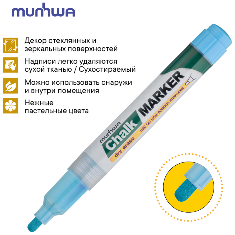 Маркер меловой MunHwa "Chalk Marker" - жидкий мел на спиртовой основе. Используется для декорирования зеркал и стекол, оформления окон, для надписей на металле и пластике. Маркеры, нанесенные на гладкую поверхность, легко удаляются сухой тканью не оставляя разводов. Меловой маркер устойчив к умеренным осадкам. После нанесения образует тонкую пленку на поверхности. Благодаря высококачественным чернилам, мел поступает дозированно, ложится на поверхность равномерным и однородным слоем, полностью закрашивая обрабатываемую поверхность. Меловой маркер - не крошится, не осыпается при нанесении и не пачкает руки. Клапанный механизм пишущего узла исключает растекание и разбрызгивание мела, преждевременное пересыхание маркера. Толщина линии письма - 3мм. Нежный голубой цвет чернил. Меловой маркер MunHwa "Chalk Marker" - это твой помощник для воплощения всех креативных решений в жизнь. Инструкция по применению: 1) Встряхнуть маркер с закрытым колпачком. 2) Открыть колпачок. Удерживая