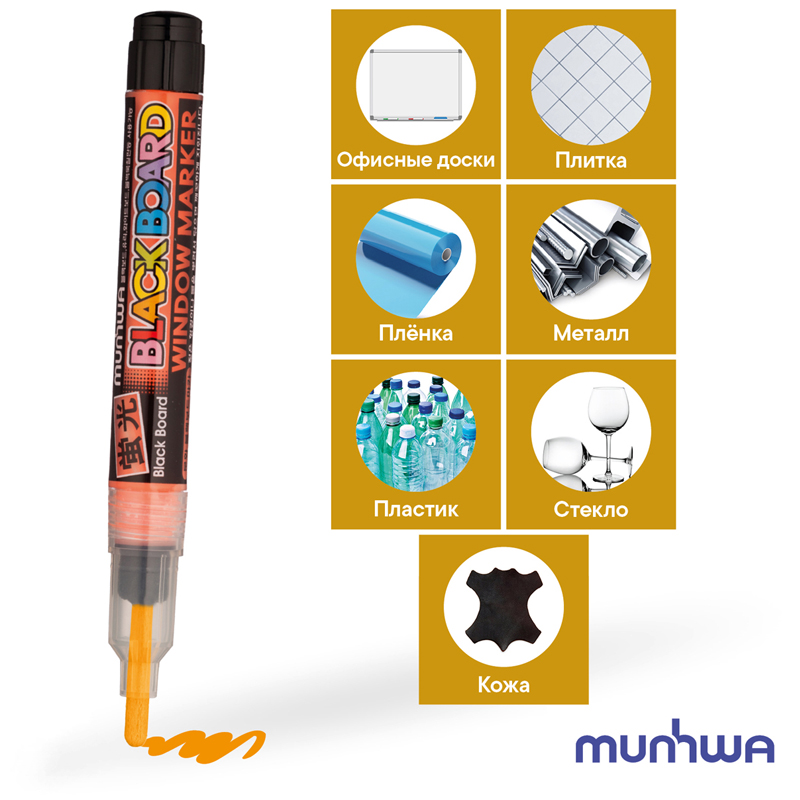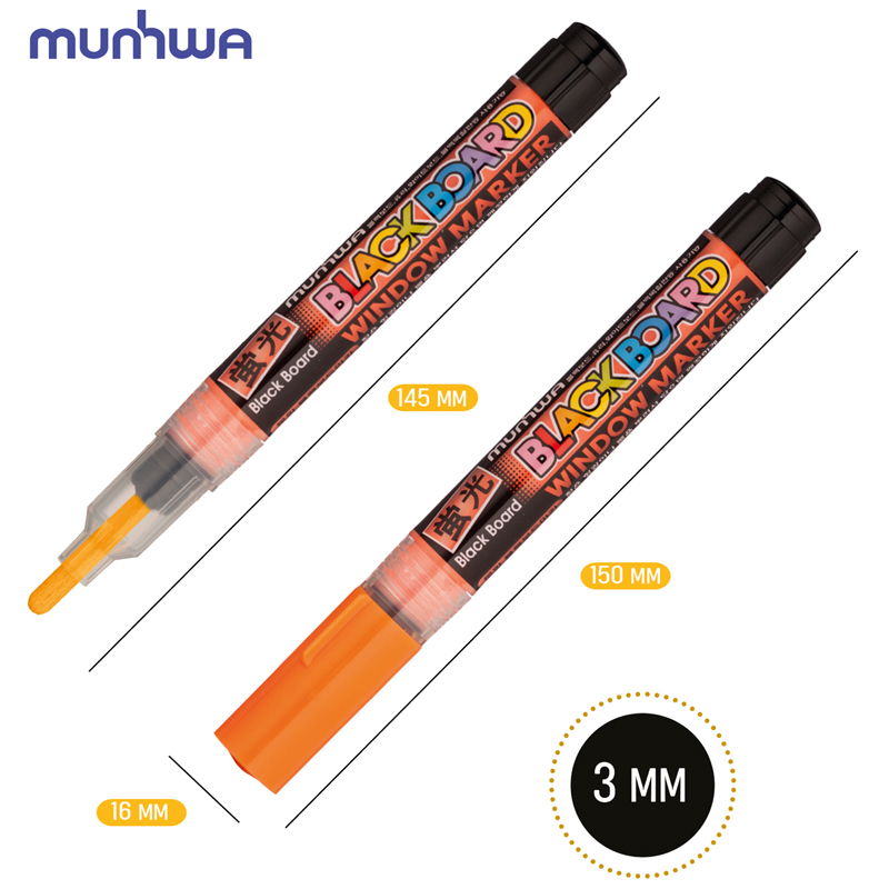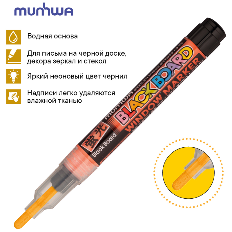 Маркер меловой MunHwa "Black Board Marker" - жидкий мел на водной основе. Используется для письма на белой и черной доске, для декорирования зеркал и стекол, оформления окон, для надписей на металле и коже, идеальный инструмент для детского творчества. Маркеры, нанесенные на гладкую поверхность, легко удаляются влажной тканью. Благодаря высококачественным чернилам, мел поступает дозированно, ложится на поверхность равномерным и однородным слоем, полностью закрашивая обрабатываемую поверхность. Меловой маркер - не крошится, не осыпается при нанесении и не пачкает руки. Клапанный механизм пишущего узла исключает растекание и разбрызгивание мела, преждевременное пересыхание маркера. Толщина линии письма - 3мм. Яркий неоновый оранжевый цвет чернил. Меловой маркер MunHwa "Black Board Marker" - это твой помощник для воплощения всех креативных решений в жизнь. Инструкция по применению: 1) Встряхнуть маркер с закрытым колпачком. 2) Открыть колпачок. Удерживая маркер в вертикальном положени