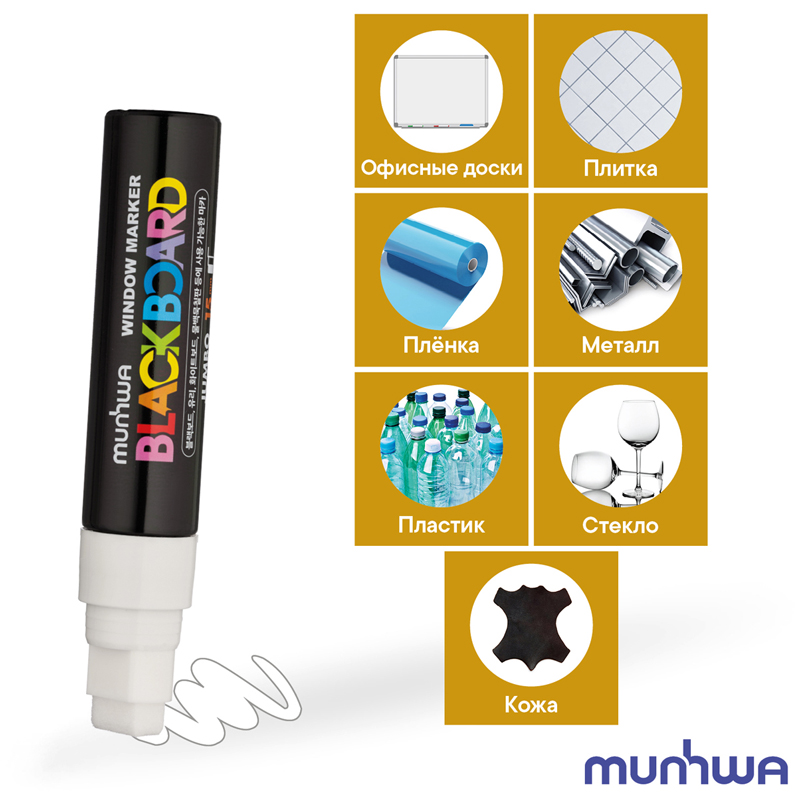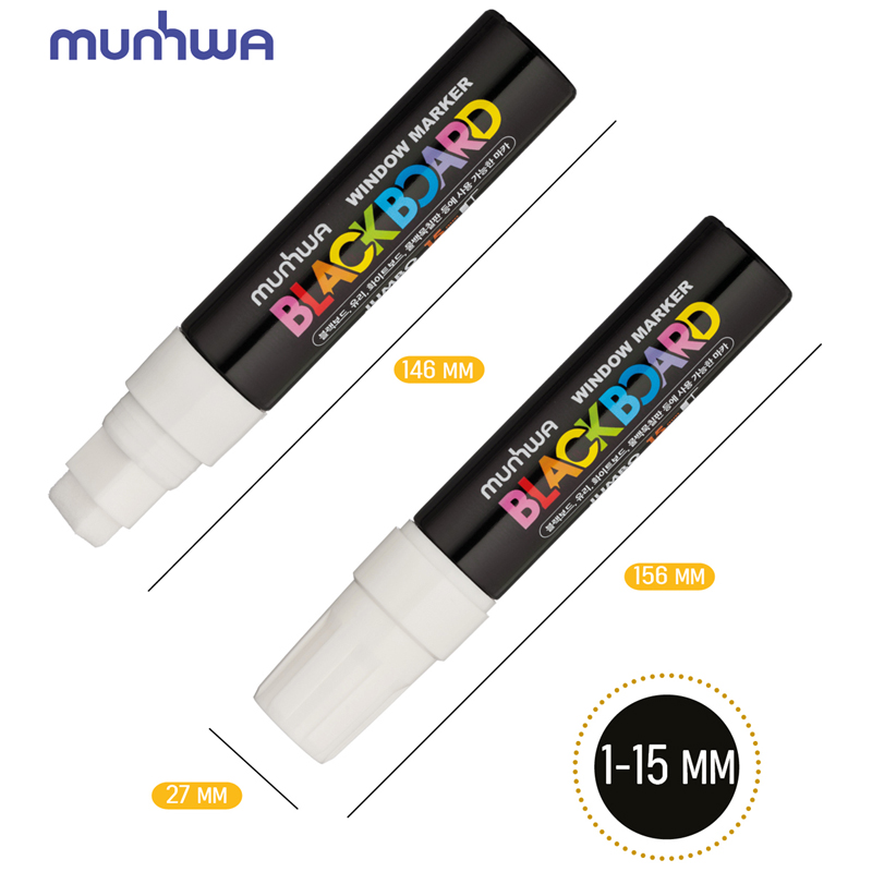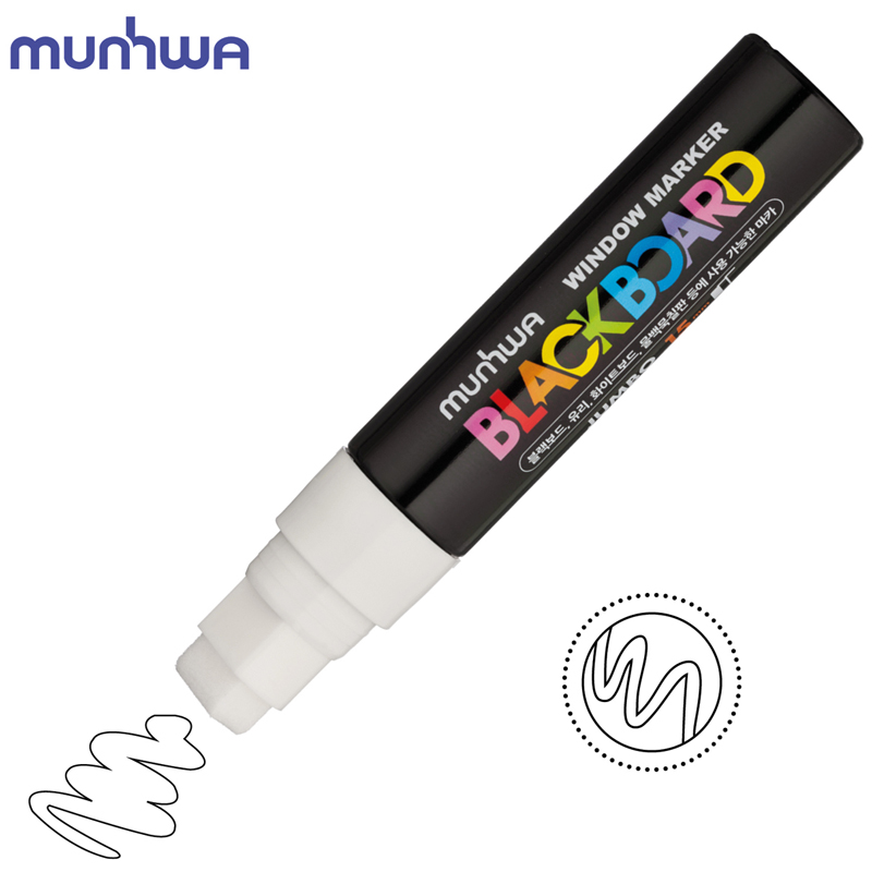 Маркер меловой MunHwa "Black Board Jumbo" - жидкий мел на водной основе. Используется для письма на белой и черной доске, для декорирования зеркал и стекол, оформления окон, для надписей на металле и коже, идеальный инструмент для детского творчества. Маркеры, нанесенные на гладкую поверхность, легко удаляются влажной тканью. Благодаря высококачественным чернилам, мел поступает дозированно, ложится на поверхность равномерным и однородным слоем, полностью закрашивая обрабатываемую поверхность. Меловой маркер - не крошится, не осыпается при нанесении и не пачкает руки. Клапанный механизм пишущего узла исключает растекание и разбрызгивание мела, преждевременное пересыхание маркера. Благодаря прямоугольному пишущему узлу толщину линии письма можно варьировать от 1 до 15 мм. Вдвое увеличенный запас чернил. Яркий неоновый белый цвет чернил. Меловой маркер MunHwa "Black Board Jumbo" - это твой помощник для воплощения всех креативных решений в жизнь. Инструкция по применению: 1) Встряхнуть мар