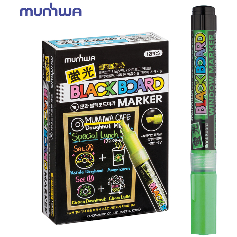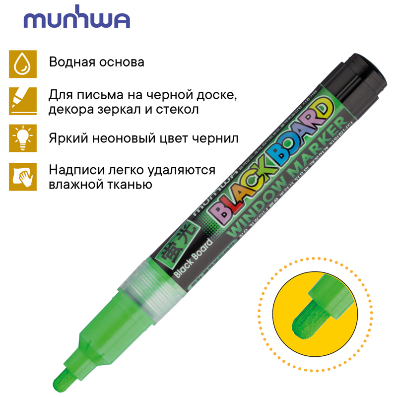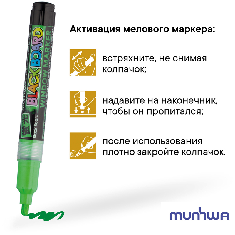 Маркер меловой MunHwa "Black Board Marker" - жидкий мел на водной основе. Используется для письма на белой и черной доске, для декорирования зеркал и стекол, оформления окон, для надписей на металле и коже, идеальный инструмент для детского творчества. Маркеры, нанесенные на гладкую поверхность, легко удаляются влажной тканью. Благодаря высококачественным чернилам, мел поступает дозированно, ложится на поверхность равномерным и однородным слоем, полностью закрашивая обрабатываемую поверхность. Меловой маркер - не крошится, не осыпается при нанесении и не пачкает руки. Клапанный механизм пишущего узла исключает растекание и разбрызгивание мела, преждевременное пересыхание маркера. Толщина линии письма - 3мм. Яркий неоновый зеленый цвет чернил. Меловой маркер MunHwa "Black Board Marker" - это твой помощник для воплощения всех креативных решений в жизнь. Инструкция по применению: 1) Встряхнуть маркер с закрытым колпачком. 2) Открыть колпачок. Удерживая маркер в вертикальном положении,