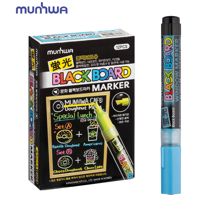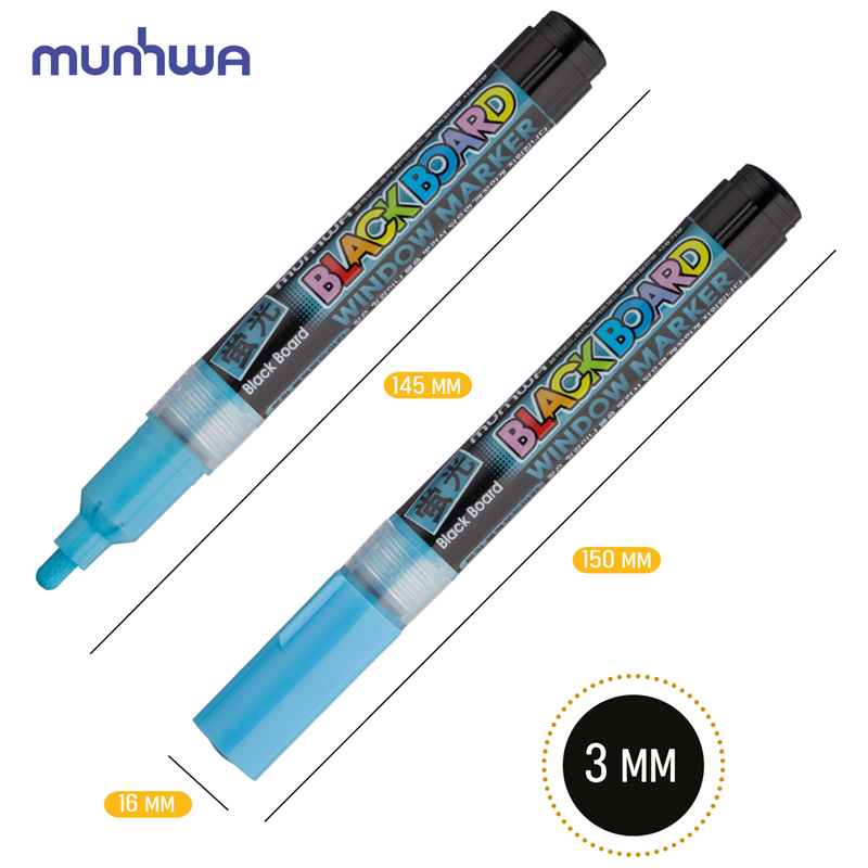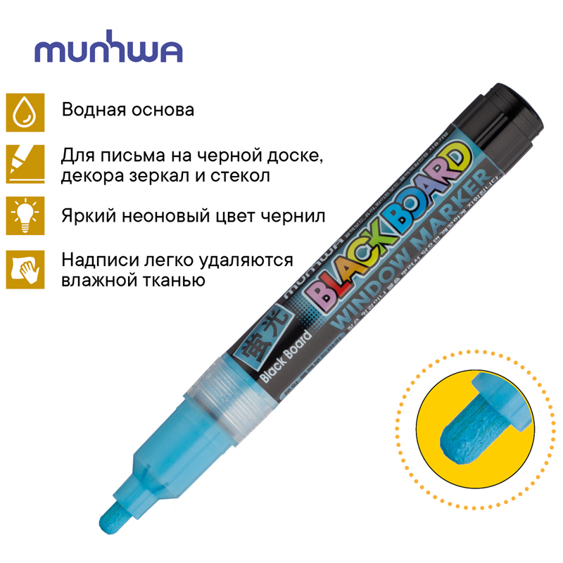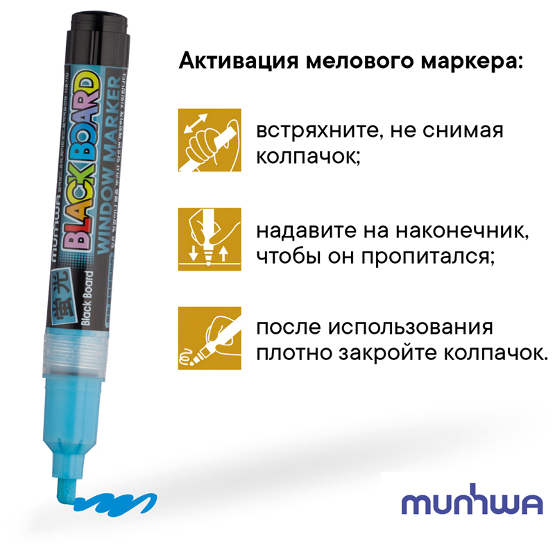 Маркер меловой MunHwa "Black Board Jumbo" - жидкий мел на водной основе. Используется для письма на белой и черной доске, для декорирования зеркал и стекол, оформления окон, для надписей на металле и коже, идеальный инструмент для детского творчества. Маркеры, нанесенные на гладкую поверхность, легко удаляются влажной тканью. Благодаря высококачественным чернилам, мел поступает дозированно, ложится на поверхность равномерным и однородным слоем, полностью закрашивая обрабатываемую поверхность. Меловой маркер - не крошится, не осыпается при нанесении и не пачкает руки. Клапанный механизм пишущего узла исключает растекание и разбрызгивание мела, преждевременное пересыхание маркера. Благодаря прямоугольному пишущему узлу толщину линии письма можно варьировать от 1 до 15 мм. Вдвое увеличенный запас чернил. Яркий неоновый голубой цвет чернил. Меловой маркер MunHwa "Black Board Jumbo" - это твой помощник для воплощения всех креативных решений в жизнь. Инструкция по применению: 1) Встряхнуть м
