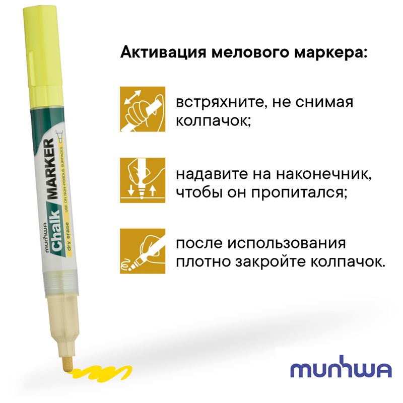 Маркер меловой MunHwa "Black Board Marker" - жидкий мел на водной основе. Используется для письма на белой и черной доске, для декорирования зеркал и стекол, оформления окон, для надписей на металле и коже, идеальный инструмент для детского творчества. Маркеры, нанесенные на гладкую поверхность, легко удаляются влажной тканью. Благодаря высококачественным чернилам, мел поступает дозированно, ложится на поверхность равномерным и однородным слоем, полностью закрашивая обрабатываемую поверхность. Меловой маркер - не крошится, не осыпается при нанесении и не пачкает руки. Клапанный механизм пишущего узла исключает растекание и разбрызгивание мела, преждевременное пересыхание маркера. Толщина линии письма - 3мм. Яркий неоновый желтый цвет чернил. Меловой маркер MunHwa "Black Board Marker" - это твой помощник для воплощения всех креативных решений в жизнь. Инструкция по применению: 1) Встряхнуть маркер с закрытым колпачком. 2) Открыть колпачок. Удерживая маркер в вертикальном положении,