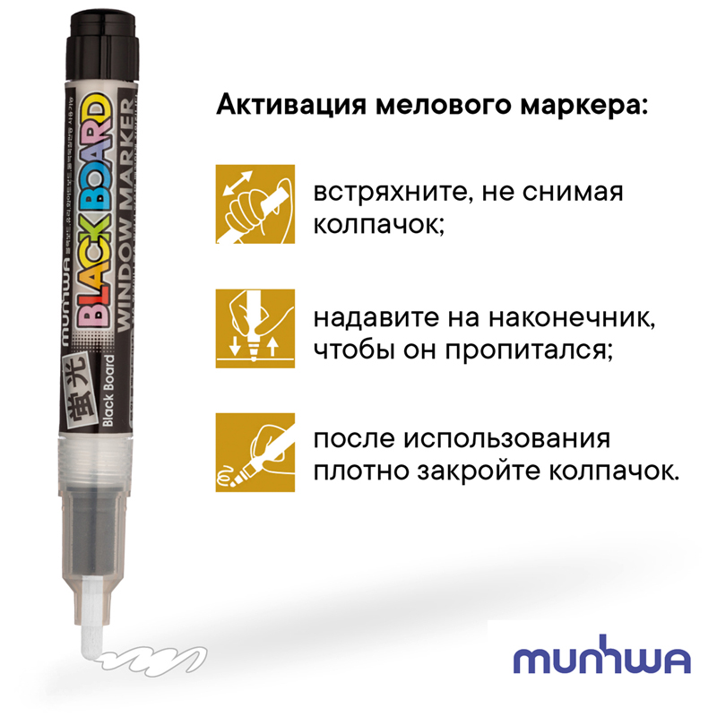 Маркер меловой MunHwa "Black Board Marker" - жидкий мел на водной основе. Используется для письма на белой и черной доске, для декорирования зеркал и стекол, оформления окон, для надписей на металле и коже, идеальный инструмент для детского творчества. Маркеры, нанесенные на гладкую поверхность, легко удаляются влажной тканью. Благодаря высококачественным чернилам, мел поступает дозированно, ложится на поверхность равномерным и однородным слоем, полностью закрашивая обрабатываемую поверхность. Меловой маркер - не крошится, не осыпается при нанесении и не пачкает руки. Клапанный механизм пишущего узла исключает растекание и разбрызгивание мела, преждевременное пересыхание маркера. Толщина линии письма - 3мм. Яркий неоновый белый цвет чернил. Меловой маркер MunHwa "Black Board Marker" - это твой помощник для воплощения всех креативных решений в жизнь. Инструкция по применению: 1) Встряхнуть маркер с закрытым колпачком. 2) Открыть колпачок. Удерживая маркер в вертикальном положении, н