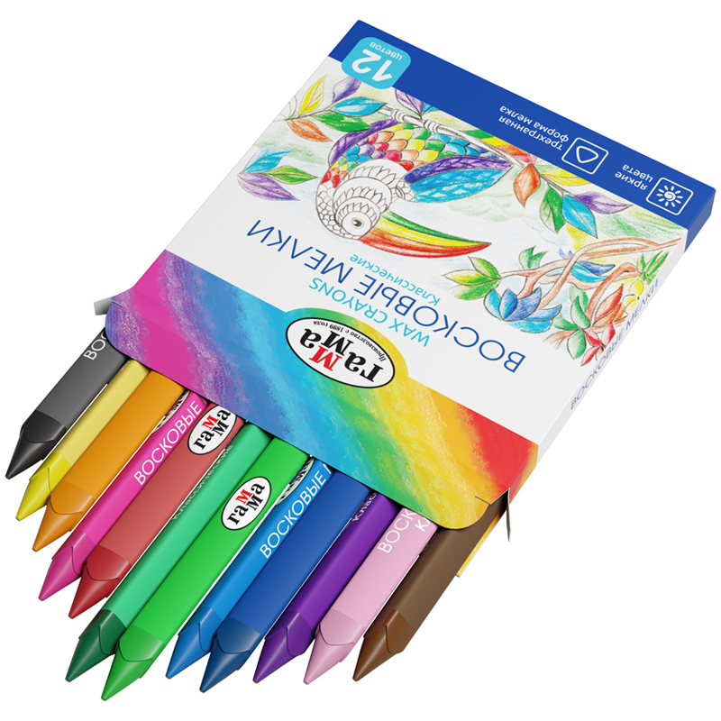 Набор из 12 восковых мелков ГАММА серии «Классическая» отлично подойдёт для рисования на бумаге, картоне и любой шероховатой поверхности. Мелки имеют эргономичную трёхгранную форму, длина мелка составляет 90 мм, а диаметр корпуса — 8 мм. В наборе 12 ярких цветов: жёлтый, зелёный, синий, красный, чёрный, коричневый, оранжевый, розовый, бледно-розовый, фиолетовый, голубой, жёлто-зелёный. Они идеальны для первых начинаний ребенка в рисовании и раскрашивании, так как они удобно лежат в руке. Мелки производятся на основе натуральных растительных компонентов: воска и естественных пищевых красителей. Мелки не пачкают руки, не липнут, не имеют выраженного химического запаха. Каждый мелок обёрнут в бумажную гильзу и уже заточен. Набор упакован в картонную коробку с европодвесом. • Количество цветов: 12; • Количество штук: 12; • Форма: трёхгранная; • Длина мелка: 90 мм; • Диаметр мелка: 8 мм
