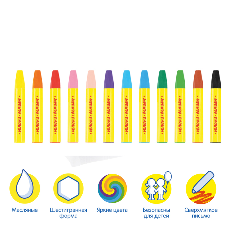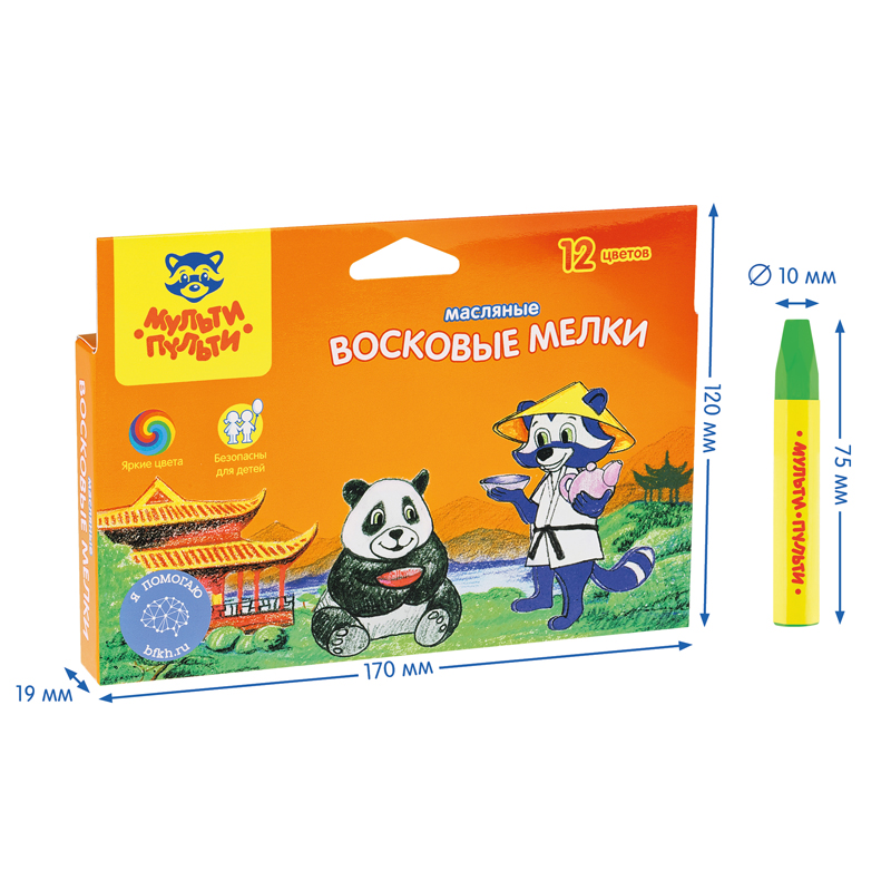 Набор из 12 масляных мелков «Мульти-Пульти» серии «Енот в Китае» подойдет для детского творчества. Длина мелка — 75 мм, а диаметр составляет 10 мм. В наборе 12 цветов: оранжевый, жёлтый, коричневый, розовый, синий, красный, серый, зелёный, белый, светло-зелёный, голубой, чёрный. Каждый мелок упакован в бумажную обёртку. Мелки шестигранной формы на масляной основе легко наносятся на бумагу, картон, дерево и керамику. Подходят для детей старше 3-х лет. Упакованы в яркую картонную коробку, которая обязательно понравится ребёнку. Не требуют особых условий транспортировки и хранения. • Длина мелка — 75 мм • Диаметр мелка: 10 мм