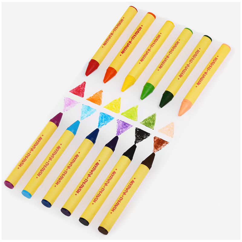 Двусторонние пластиковые трёхгранные цветные мелки «Мульти-Пульти» серии «Приключения Енота» отлично подходят для детского творчества. Длина мелка — 90 мм, диаметр составляет 7/10 мм. 12 ярких цветов: оранжевый, красный, жёлтый, голубой, розовый, зелёный, синий, чёрный, коричневый, фиолетовый, светло-коричневый. С помощью одного мелка можно рисовать тонкие и толстые линии. Мелки не крошатся, не имеют запаха и не пачкают руки. Упакованы в картонную коробку с европодвесом. • Количество цветов: 12; • Длина мелка: 90 мм; • Диаметр мелка: 7/10 мм