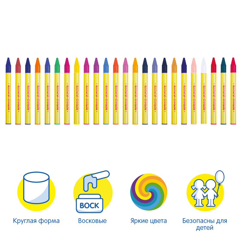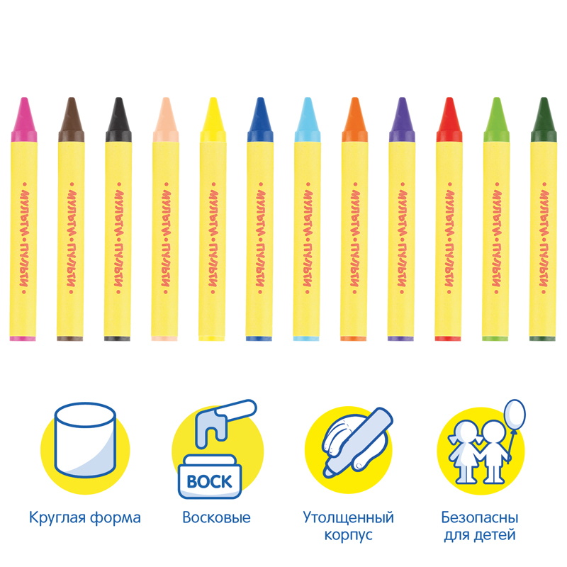 Набор из 12 цветных восковых мелков ГАММА серии «Мультики» отлично подойдёт для рисования на бумаге, картоне и любой шероховатой поверхности. Мелки имеют круглую форму, длина мелка составляет 90 мм, а диаметр корпуса — 8 мм. В наборе 12 ярких цветов: желтый, оранжевый, красный, розовый, красно-фиолетовый, желто-зеленый, зеленый, голубой, синий, фиолетовый, коричневый, черный. Они идеальны для первых начинаний ребенка в рисовании и раскрашивании, так как они удобно лежат в руке. Мелки производятся на основе натуральных растительных компонентов: воска и пигментов. Мелки не липнут к рукам и не пачкают их, не имеют выраженного химического запаха. Каждый мелок обёрнут в бумажную гильзу и уже заточен. Набор упакован в яркую картонную коробку с мультяшными героями, которая особенно понравится ребёнку. • Количество цветов:12; • Количество штук: 12; • Форма: круглая; • Длина мелка: 90 мм; • Диаметр мелка: 8 мм