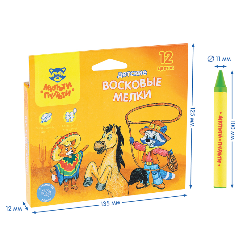 Набор из 12 круглых восковых мелков «Мульти-Пульти» серии «Енот в Мексике» подойдет для детского творчества. Длина мелка —100 мм, а диаметр составляет 11 мм. В наборе 12 цветов: оранжевый, жёлтый, коричневый, розовый, синий, красный, светло-коричневый, зелёный, фиолетовый, светло-зелёный, голубой, чёрный. Каждый мелок имеет бумажную обёртку. Мелки утолщённой формы на восковой основе легко наносятся на бумагу, картон, дерево и керамику. Подходят для детей старше 3-х лет. Упакованы в яркую картонную коробку, которая обязательно понравится ребёнку. Не требуют особых условий транспортировки и хранения. • Длина мелка — 100 мм • Диаметр мелка: 11 мм