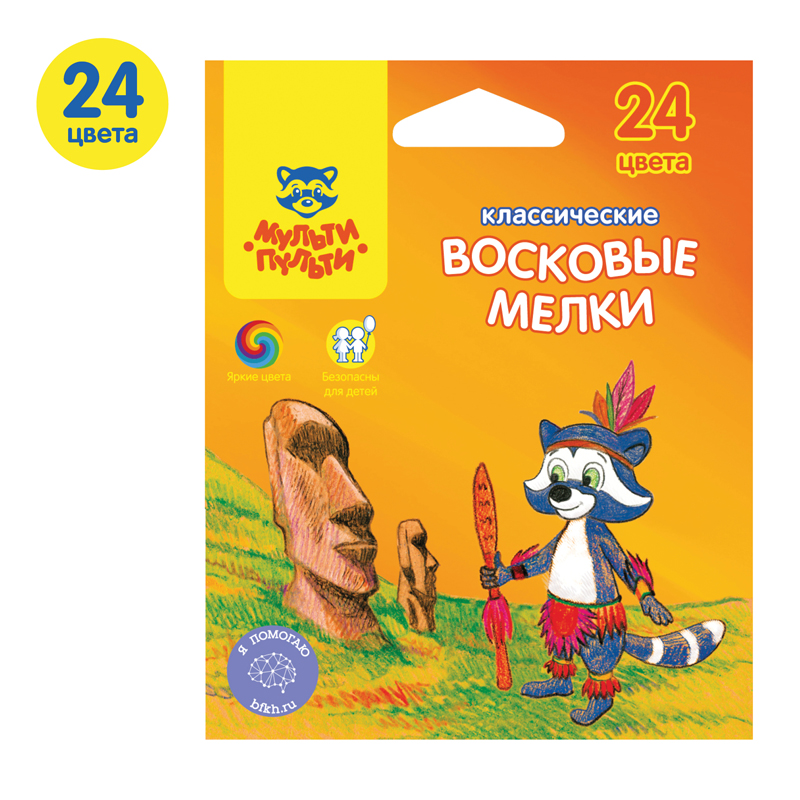 Набор из 12 восковых мелков «Мульти-Пульти» серии «Енот на острове Пасхи» отлично подходит для рисования и воплощения смелых творческих идей. В наборе 24 ярких цвета. Мелки имеют круглую форму, длина мелка составляет 90 мм, а диаметр корпуса — 8 мм. Они легко наносятся на бумагу, картон, дерево, керамику. Особых условий хранения и транспортировки не требуют. Подходят для детей старше 3-х лет. Каждый мелок представлен в бумажной обёртке. Набор упакован в картонную коробку с европодвесом. • Количество цветов: 24; • Количество штук: 24; • Форма: круглая; • Длина: 90 мм; • Диаметр: 8 мм