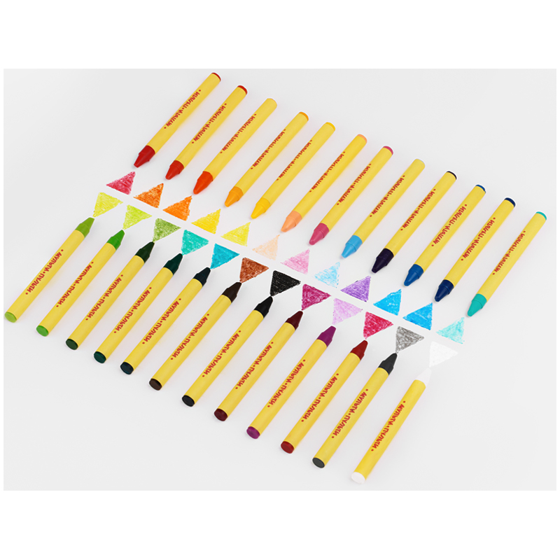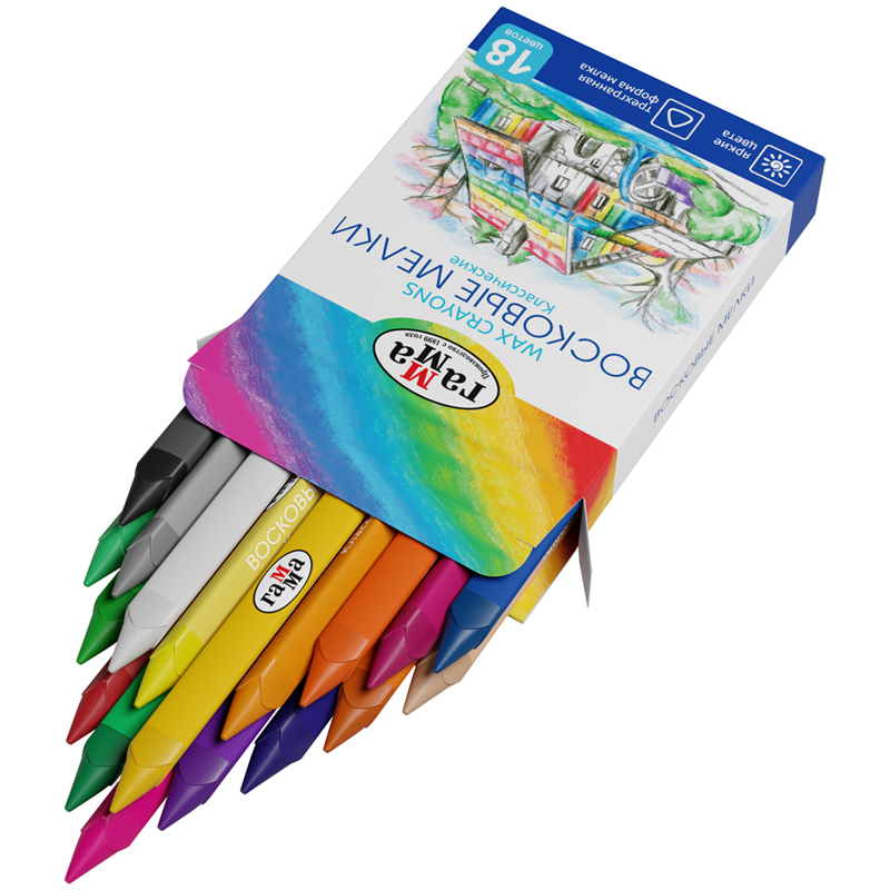 Набор из 18 восковых мелков ГАММА серии «Классическая» отлично подойдёт для рисования на бумаге, картоне и любой шероховатой поверхности. Мелки имеют эргономичную трёхгранную форму, длина мелка составляет 90 мм, а диаметр корпуса — 8 мм. В наборе 18 ярких цветов. Они идеальны для первых начинаний ребенка в рисовании и раскрашивании, так как они удобно лежат в руке. Мелки производятся на основе натуральных растительных компонентов: воска и естественных пищевых красителей. Мелки не пачкают руки, не липнут, не имеют выраженного химического запаха. Каждый мелок обёрнут в бумажную гильзу и уже заточен. Набор упакован в картонную коробку с европодвесом. • Количество цветов: 18; • Количество штук: 18; • Форма: трёхгранная; • Длина мелка: 90 мм; • Диаметр мелка: 8 мм