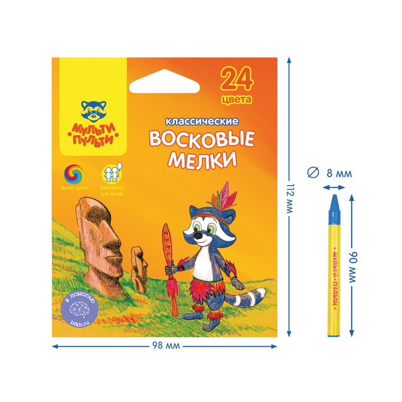 Набор из 12 восковых мелков «Мульти-Пульти» серии «Енот на острове Пасхи» отлично подходит для рисования на картоне и бумаге. Мелки имеют шестигранную форму, длина мелка составляет 85 мм, а диаметр корпуса — 8 мм. В наборе 12 ярких цветов: жёлтый, зелёный, синий, красный, чёрный, коричневый, оранжевый, светло-коричневый, голубой, розовый, тёмно-синий, фиолетовый. Мелки не токсичны. Каждый мелок представлен в бумажной обёртке. Набор упакован в картонную коробку с европодвесом. • Количество цветов: 12; • Количество штук: 12; • Форма: шестигранная; • Длина: 85 мм; • Диаметр: 8 мм