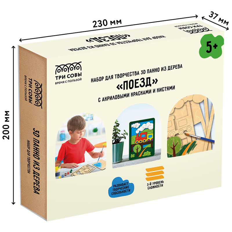 Набор для творчества «ТРИ СОВЫ» для создания 3D-панно из дерева станет отличным подарком. Он поможет развить образное мышление, логику, моторику и творческий потенциал ребенка. Набор «Поезд» подойдёт для начинающих юных художников и совместного времяпрепровождения детей и их родителей. В комплект входит: 1. 5-слойная фанера с нанесённым контуром для раскрашивания; 2. акриловые краски 6 цветов по 3 мл; 3. кисть средняя круглая и плоская; 4. крепление на стену 1 шт.; 5. настольная подставка. Клей не входит в комплект! Можно использовать любой, подходящий для дерева (в том числе ПВА). В процессе работы каждая деталь раскрашивается отдельно, просушивается, затем они склеиваются в красивое 3D-панно. Готовую работу можно повесить на стену или поставить на подставку на стол. Набор упакован в коробку из крафтового картона с красочной информационной лентой. Размер 19,5*13,5*1,5 см. «ТРИ СОВЫ» – время с пользой! • Материал основы: фанера; • Краски: акриловые;<