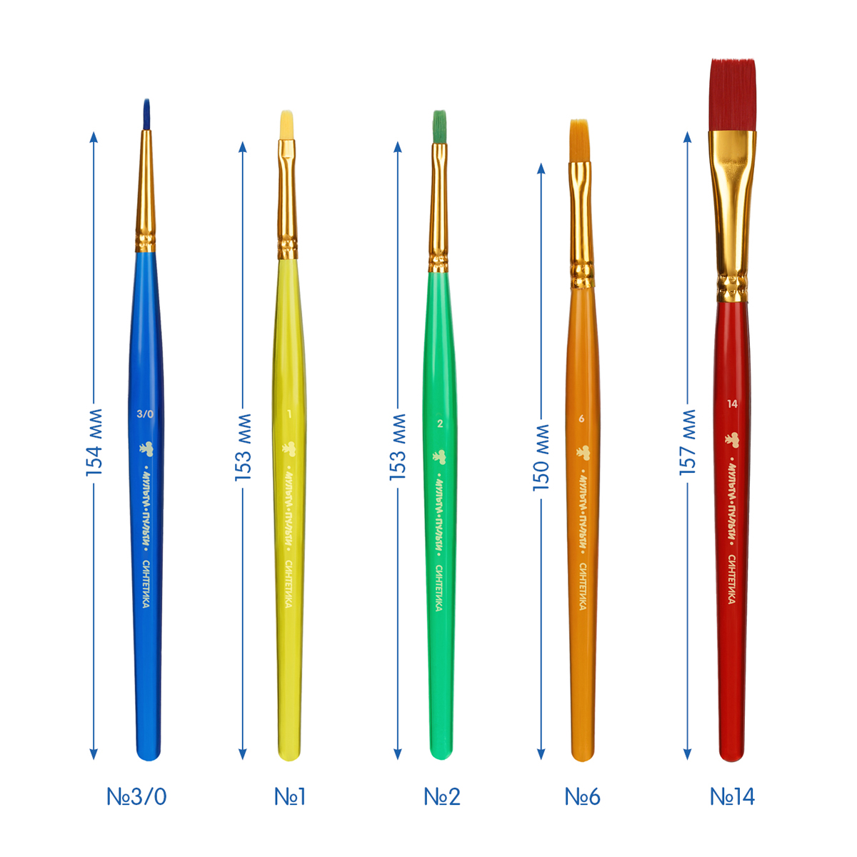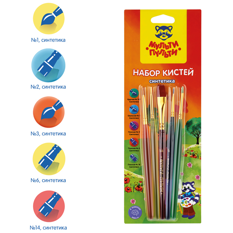 Набор художественных кистей для рисования «Мульти-Пульти» изготовлен из синтетического материала. Кисти разной формы позволят протестировать вариативные мазки и расширят возможности в процессе создания картины. Идеально подоходят для работы с акварелью и гуашью. Кисти смешанных форм с короткими пластиковыми ручками подходят для детей от 3 лет. В наборе представлено 5 шт: овальные - №1, плоские - № 2,6,14, круглые - № 1. Товар упакован в блистер с европодвесом. • Количество в упаковке: 5 шт; • Волос: синтетика; • Форма кисти: смешанная; • Тип ручки: короткая; • Материал ручки: пластик.