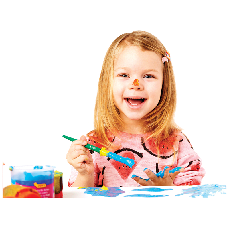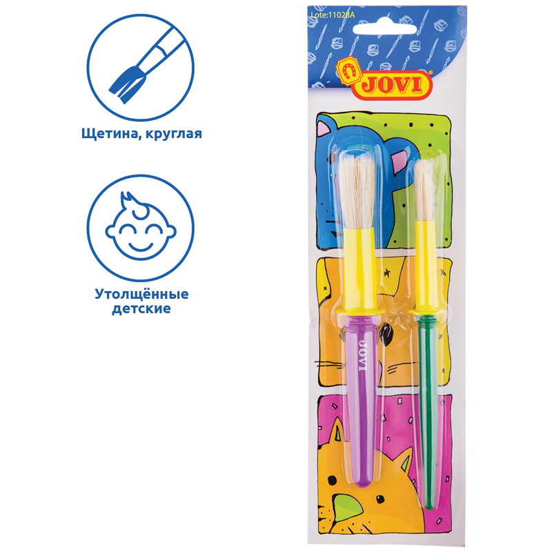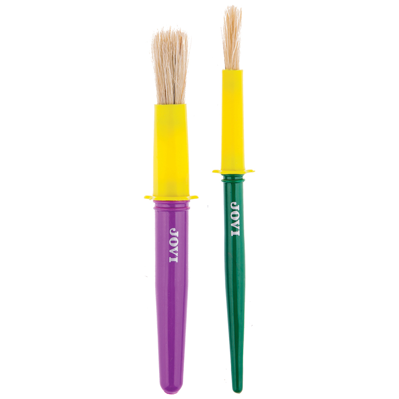 Набор JOVI из двух больших кисточек разного размера для малышей. Эти кисти прекрасно подходят для начальных опытов рисования, раскрашивания красками или водой, создания первых поделок. Кисти с крупными, но лёгкими ручками из яркой пластмассы; утолщённая и более тонкая. Длинная упругая щетина очень удобна для ребёнка, её хорошо видно на бумаге и малышу легко контролировать процесс нанесения краски или клея.