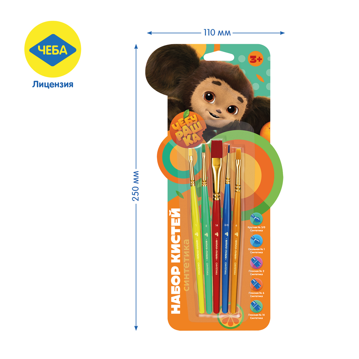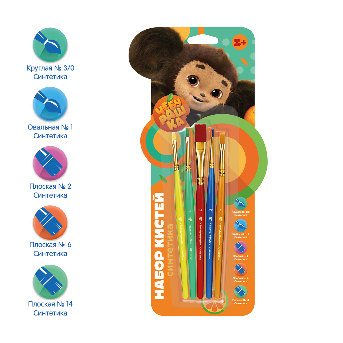 Набор художественных кистей для рисования «Мульти-Пульти» серии "Чебурашка" изготовлен из синтетического материала. Кисти разной формы позволят протестировать вариативные мазки и расширят возможности в процессе создания картины. Хорошо подходят для работы с различными типами красок. Каждая кисть имеет тиснение с силуэтом любимого героя - Чебурашки, что делает этот набор действительно необычным. Кисти смешанных форм с короткими пластиковыми ручками подходят для детей от 3 лет. В наборе представлено 5 шт: овальные - №1, плоские - № 2,6,14, круглые - № 1. Товар упакован в блистер с европодвесом. • Количество в упаковке: 5 шт; • Волос: синтетика; • Форма кисти: смешанная; • Тип ручки: короткая; • Материал ручки: пластик.