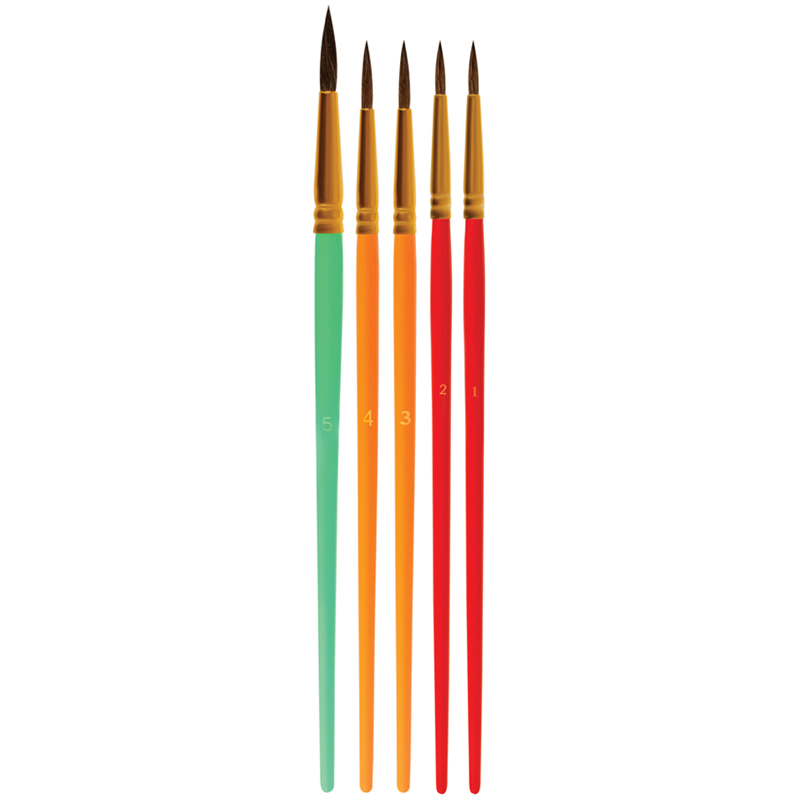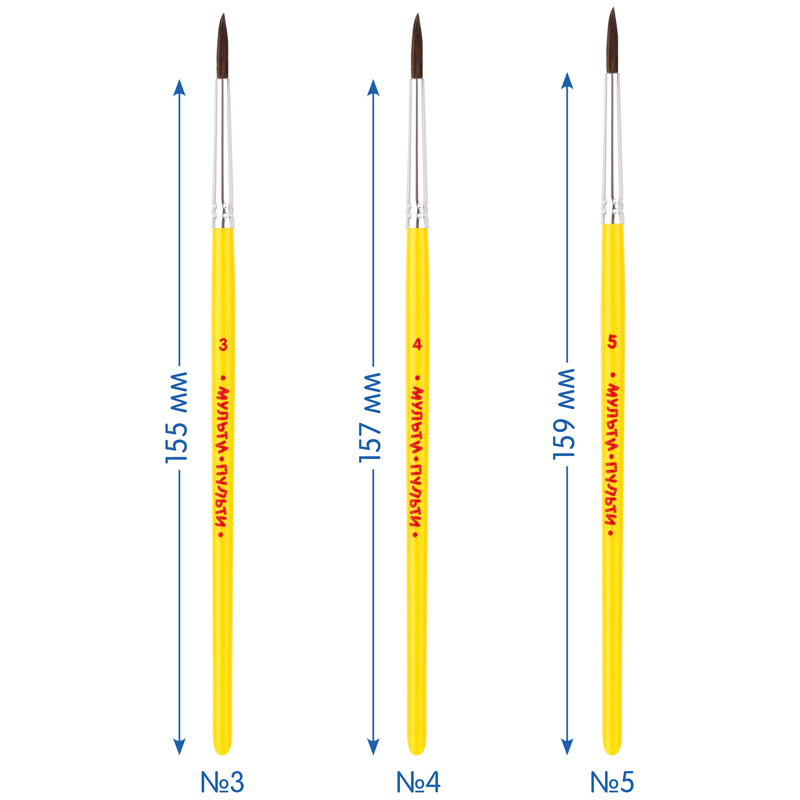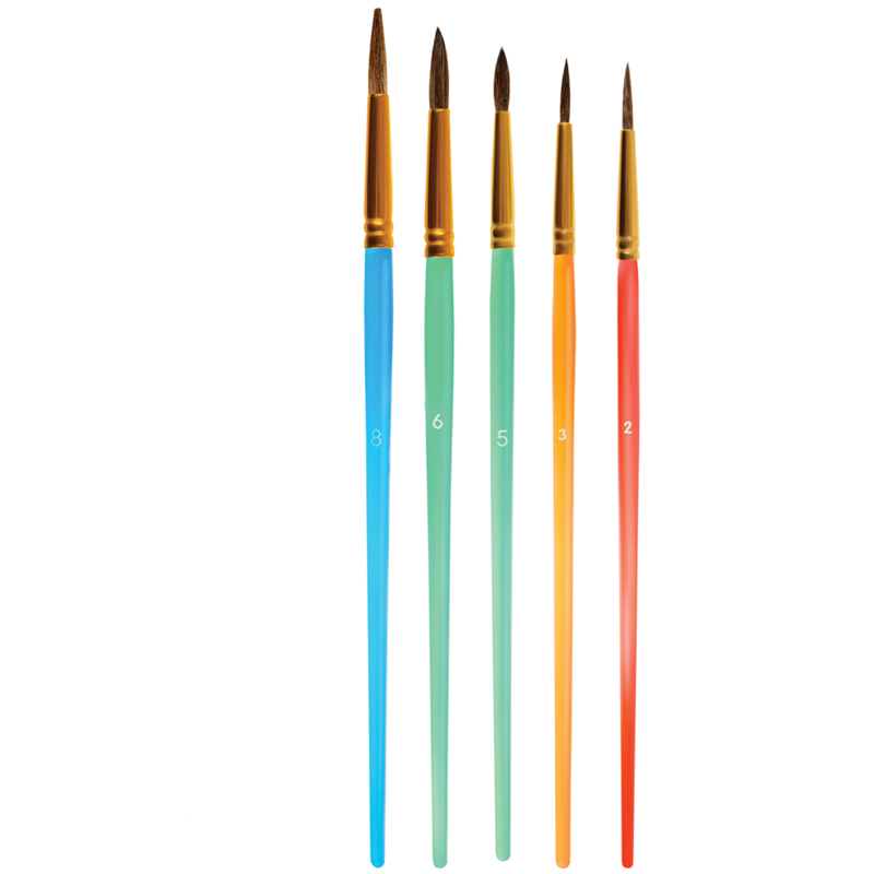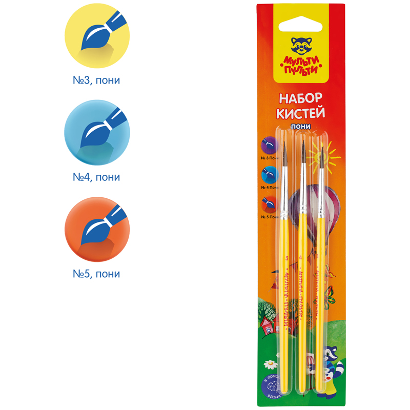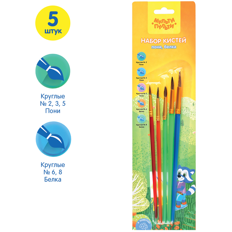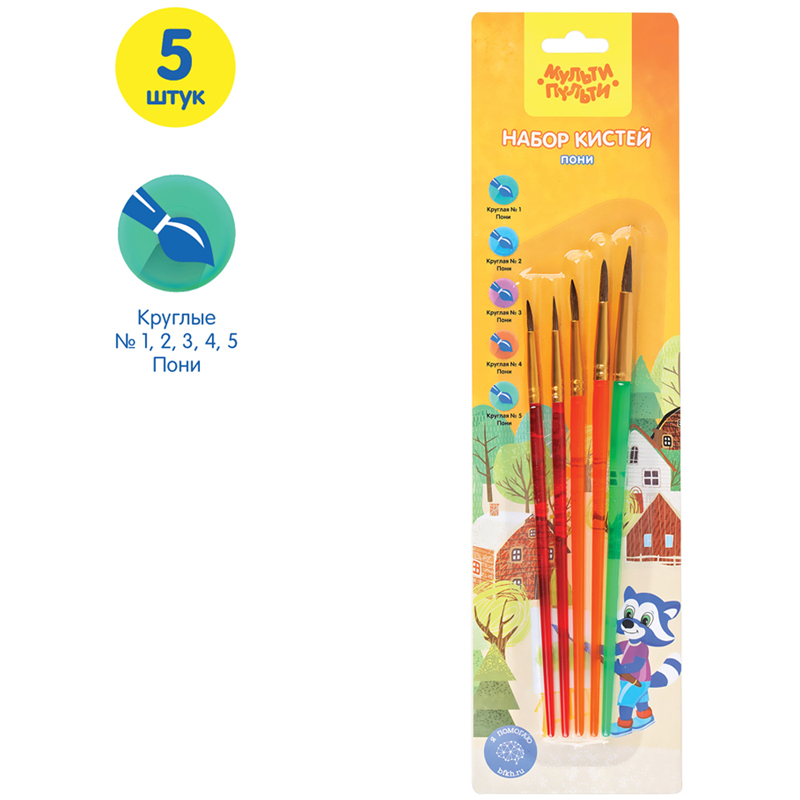 Набор кистей для рисования «Мульти-Пульти» предназначен для детей с начальным и средним уровнем подготовки. В набор входят 5 круглых кистей 1, 2, 3, 4, 5. Волос пони средней жесткости и по структуре толще чем волос белки, поэтому влаги такая кисть набирает меньше. Прозрачные пластиковые ручки не боятся воды, легко моются и отлично смотрятся. Кисти имеют двойной обжим обоймы и надежное клеевое скрепление с корпусом ручки. • Количество в наборе: 5; • Номер: 1, 2, 3, 4, 5; • Форма кисти: круглая; • Волос: пони.