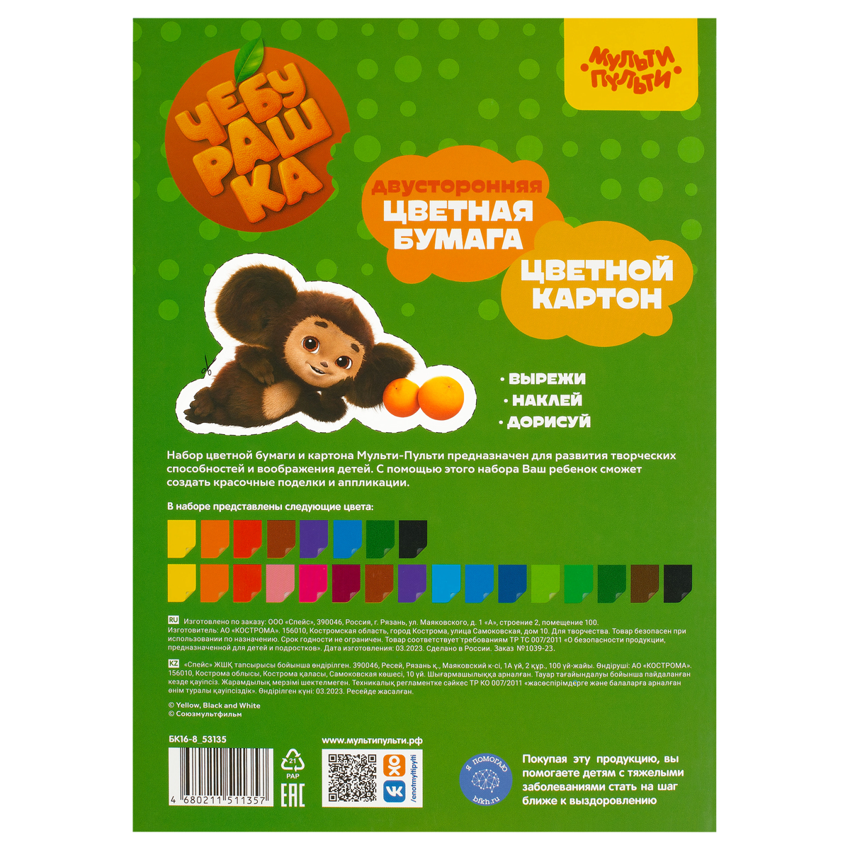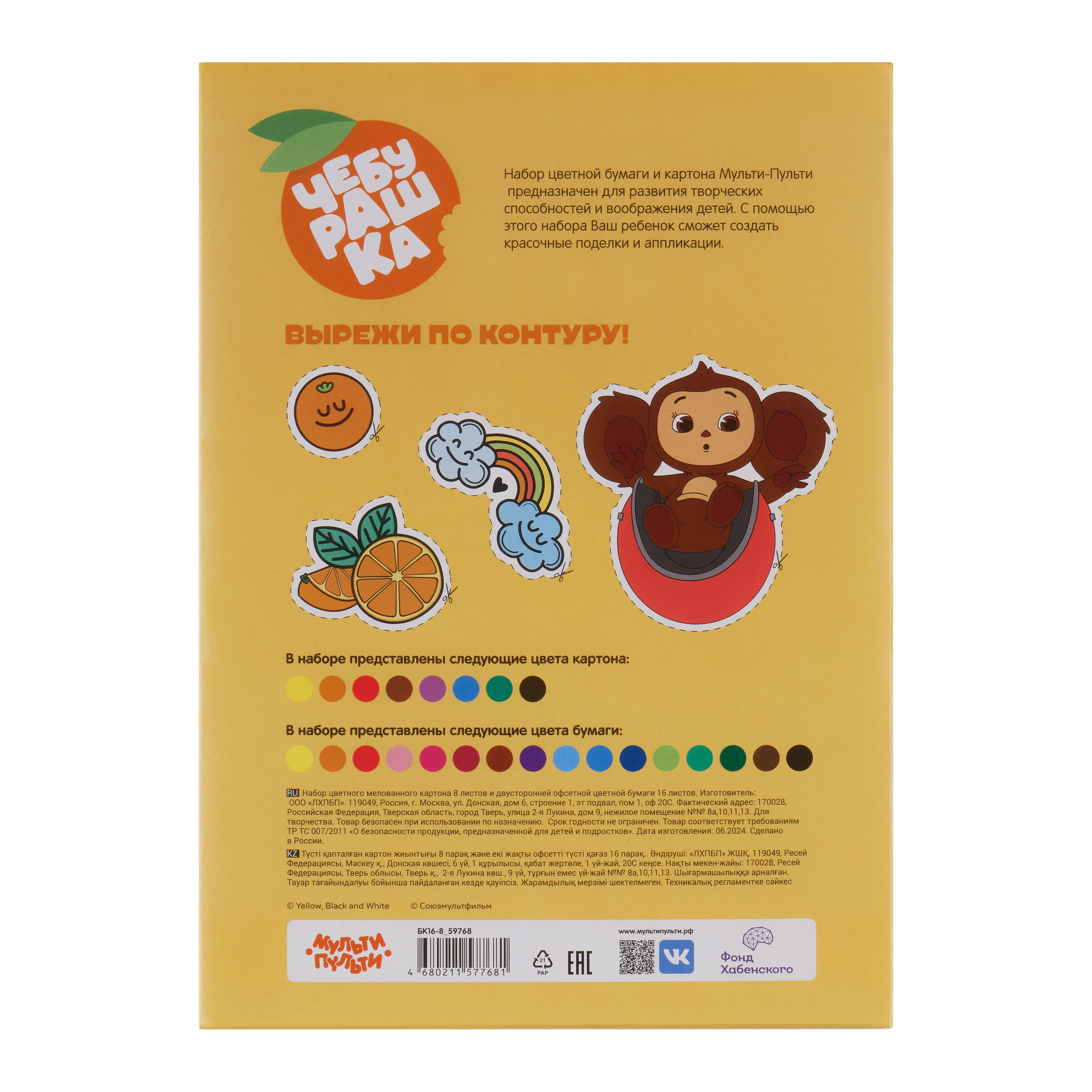 Набор цветной бумаги и картона «Мульти-Пульти» серии «Чебурашка» – это универсальный помощник для воплощения творческих идей. В наборе ребёнок найдёт всё необходимое для создания поделок и аппликаций: 8 листов матового немелованного картона плотностью не менее 215 г/м2, 16 листов газетной бумаги плотностью 45 г/м2. Формат листов – А4. Картон представлен в 8 цветах, двусторонняя бумага – в 16. Папка на склейке защищает внутренний блок от замятия и загрязнения. Дизайн набора с полюбившимся всем ушастым героем привлекает внимание детей, вдохновляет их на творчество. На оборотной стороне обложки изображён персонаж, которого можно вырезать и сделать с ним поделку, аппликацию. Для детей старше 3-х лет. • Формат: А4; • Количество листов бумаги: 16; • Количество листов картона: 8; • Плотность бумаги: 45 г/м2; • Плотность картона: 215 г/м2; • Вид бумаги: газетная.