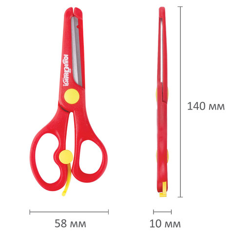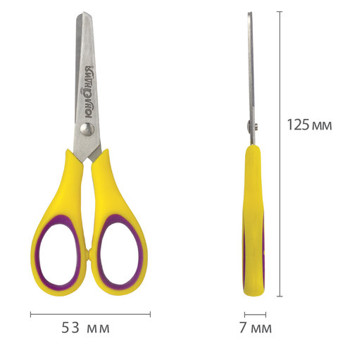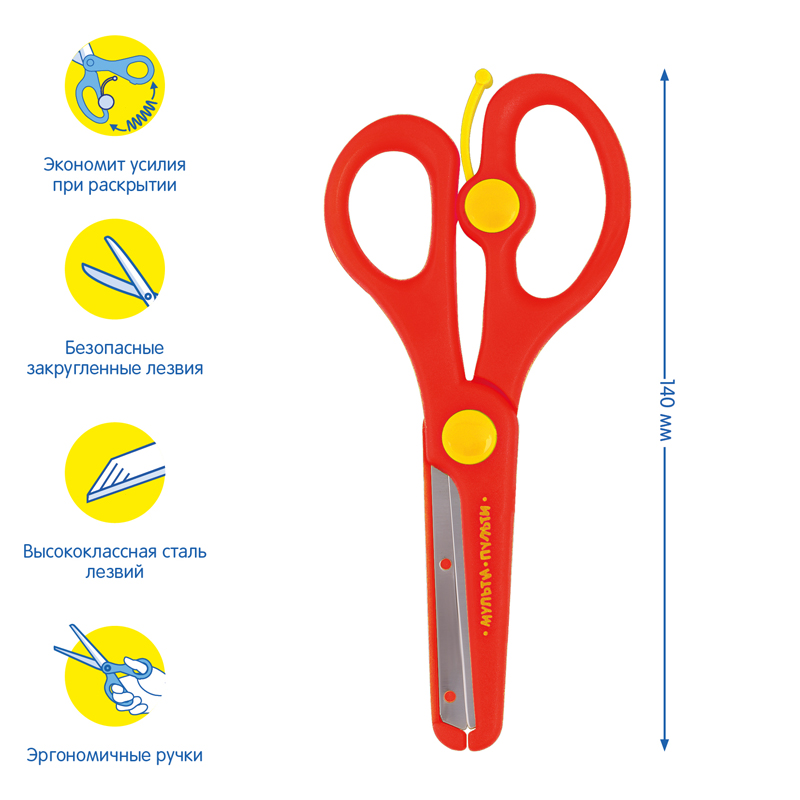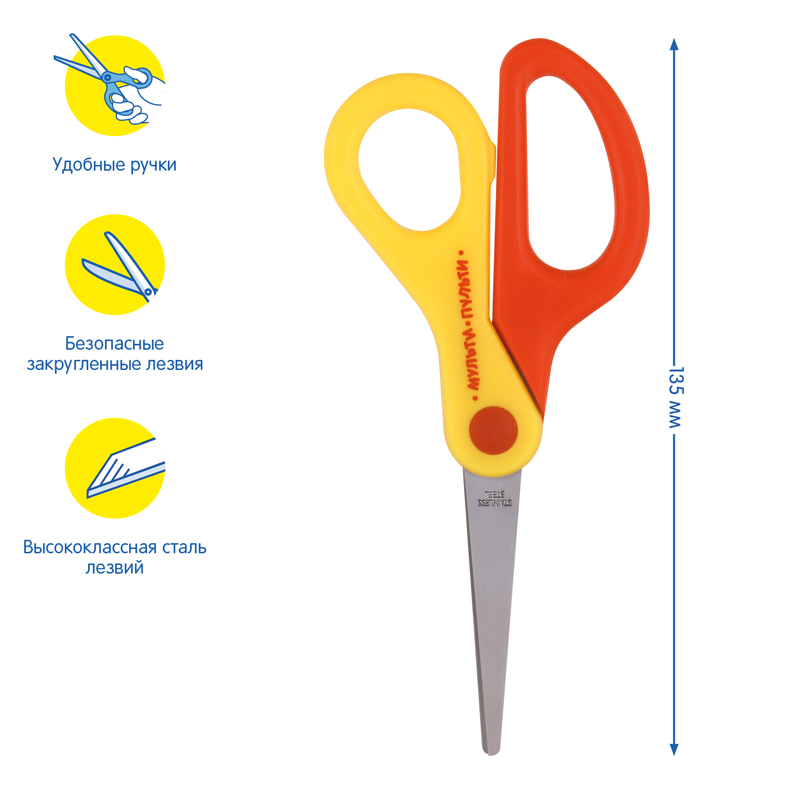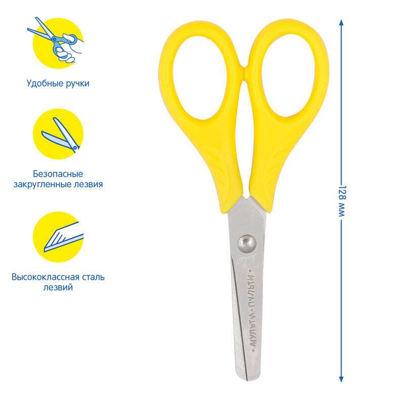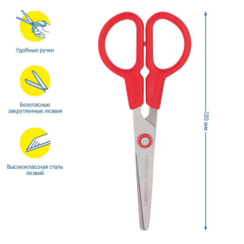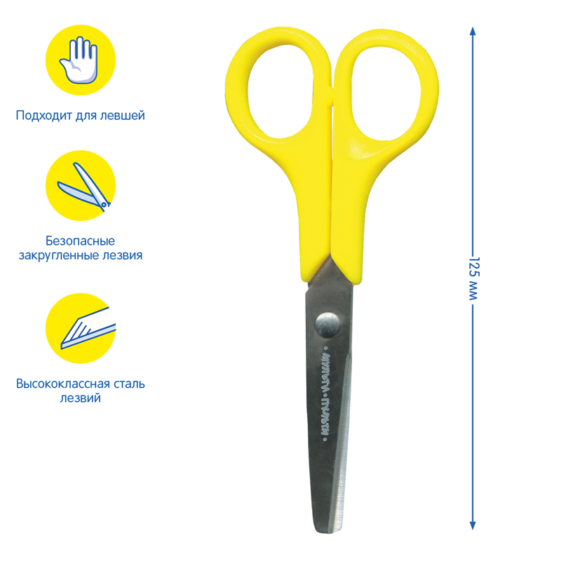 Длина: 12,5 см Безопасные лезвия: да Эргономичные ручки: нет Подходит для левшей: да Форма лезвий: прямые закругленные Материал лезвий: нержавеющая сталь Покрытие лезвий: нет Рисунок на лезвии: нет Наличие линейки на лезвии: нет Симметричные ручки: да Фигурные ручки: нет Материал ручек: пластик Наличие вставок: нет Наличие фиксатора: нет Наличие футляра: нет Возрастная группа: младшие школьники