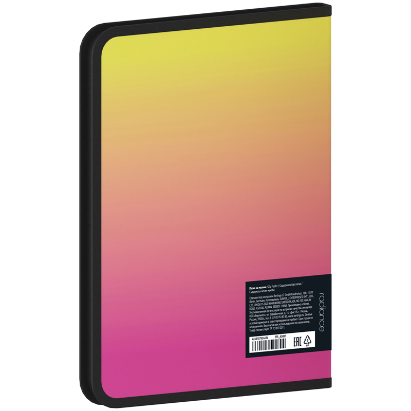 Папка на молнии Berlingo серии Radiance формата А5+ идеальна для хранения и транспортировки документов. Снаружи папка имеет жёлтый/розовый градиент, внутри - чёрный цвет. Изделие размером 245*200*10 мм изготовлено из высококачественного полипропилена толщиной 600 мкм с матовой текстурой поверхности "песок", на которой не видно отпечатков пальцев и мелких царапин. Папка имеет надежную молнию с мягким ходом. Изделие вмещает 300 листов. Индивидуальная упаковка в пакет. • Вместимость, в листах: 300; • Материал: пластик; • Наличие ручки: нет; • Размер: 245*200*10 мм; • Способ фиксации: молния; • Текстура: песок; • Толщина материала: 600 мкм; • Формат: А5+; • Цвет канта: чёрный; • Цвет папки: жёлтый/розовый градиент.
