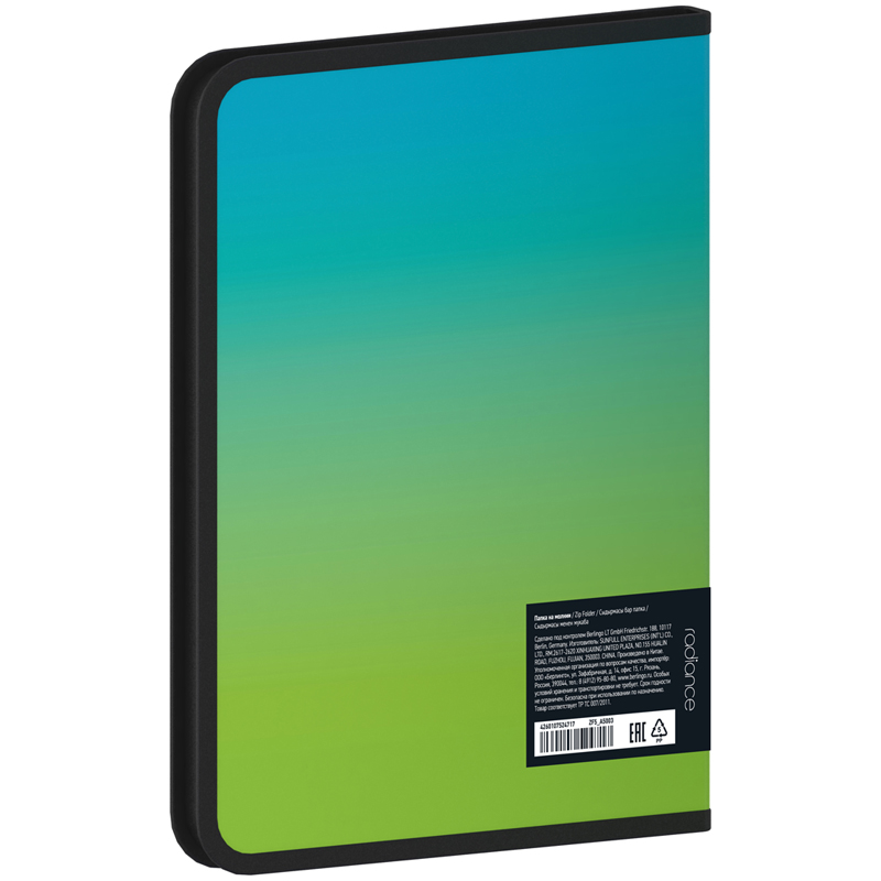 Папка на молнии Berlingo серии Radiance формата А5+ идеальна для хранения и транспортировки документов. Снаружи папка имеет голубой/зелёный градиент, внутри - чёрный цвет. Изделие размером 245*200*10 мм изготовлено из высококачественного полипропилена толщиной 600 мкм с матовой текстурой поверхности "песок", на которой не видно отпечатков пальцев и мелких царапин. Папка имеет надежную молнию с мягким ходом. Изделие вмещает 300 листов. Индивидуальная упаковка в пакет. • Вместимость, в листах: 300; • Материал: пластик; • Наличие ручки: нет; • Размер: 245*200*10 мм; • Способ фиксации: молния; • Текстура: песок; • Толщина материала: 600 мкм; • Формат: А5+; • Цвет канта: чёрный; • Цвет папки: голубой/зелёный градиент.