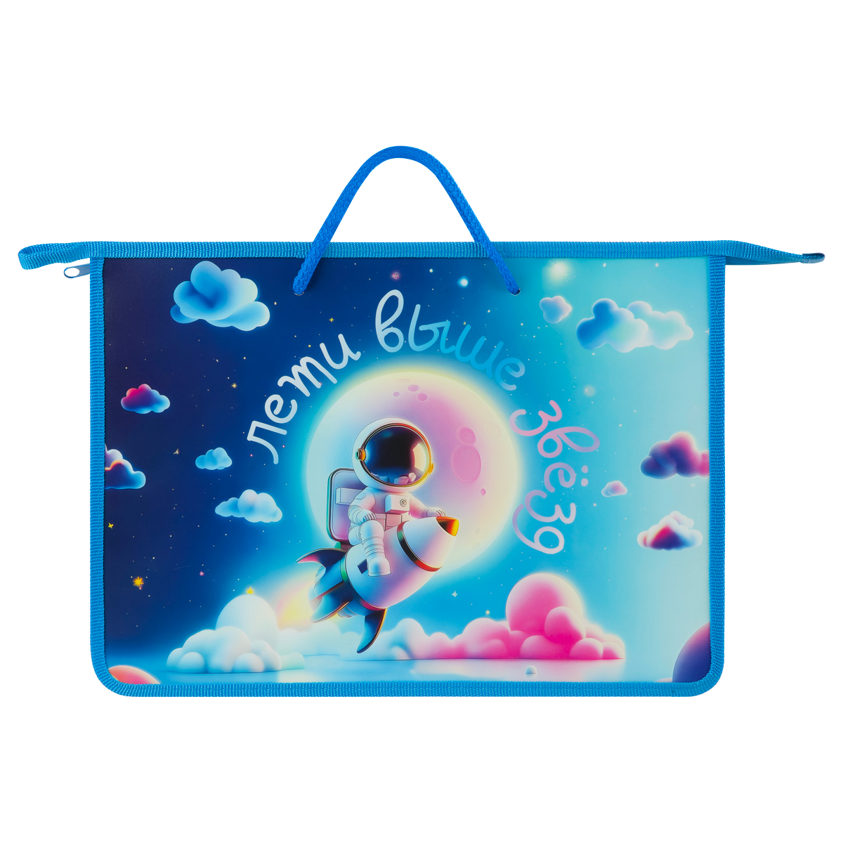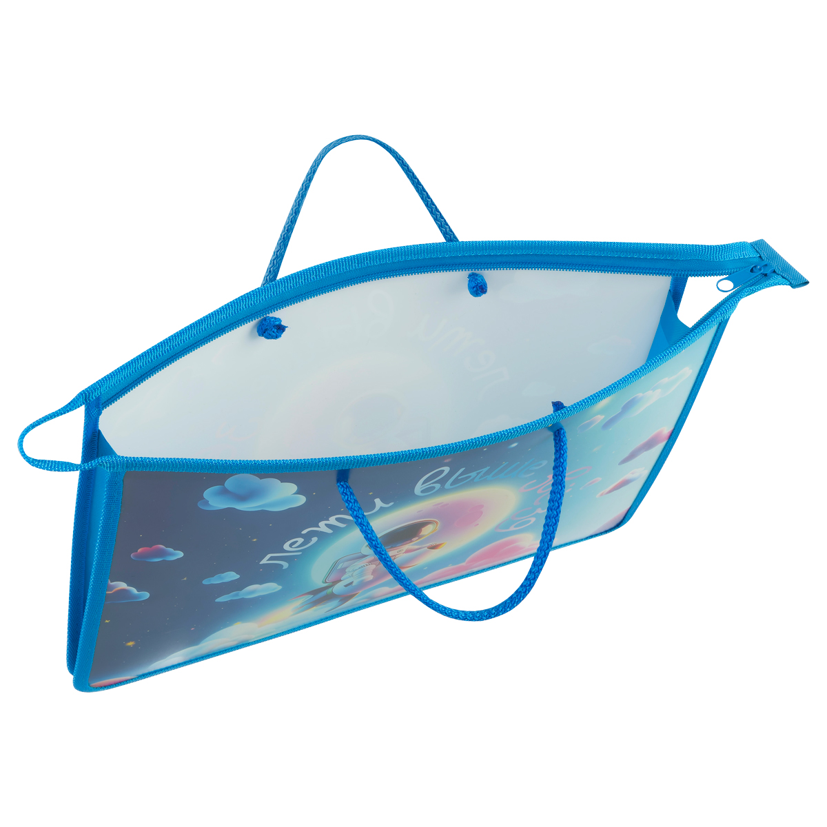 Папка на молнии с ручками формата А4 выполнена из пластика, по краям имеет тканевую окантовку. Одно отделение. Ручки-тесьма. Застежка-молния расположена по верхнему краю папки. Цветная печать.