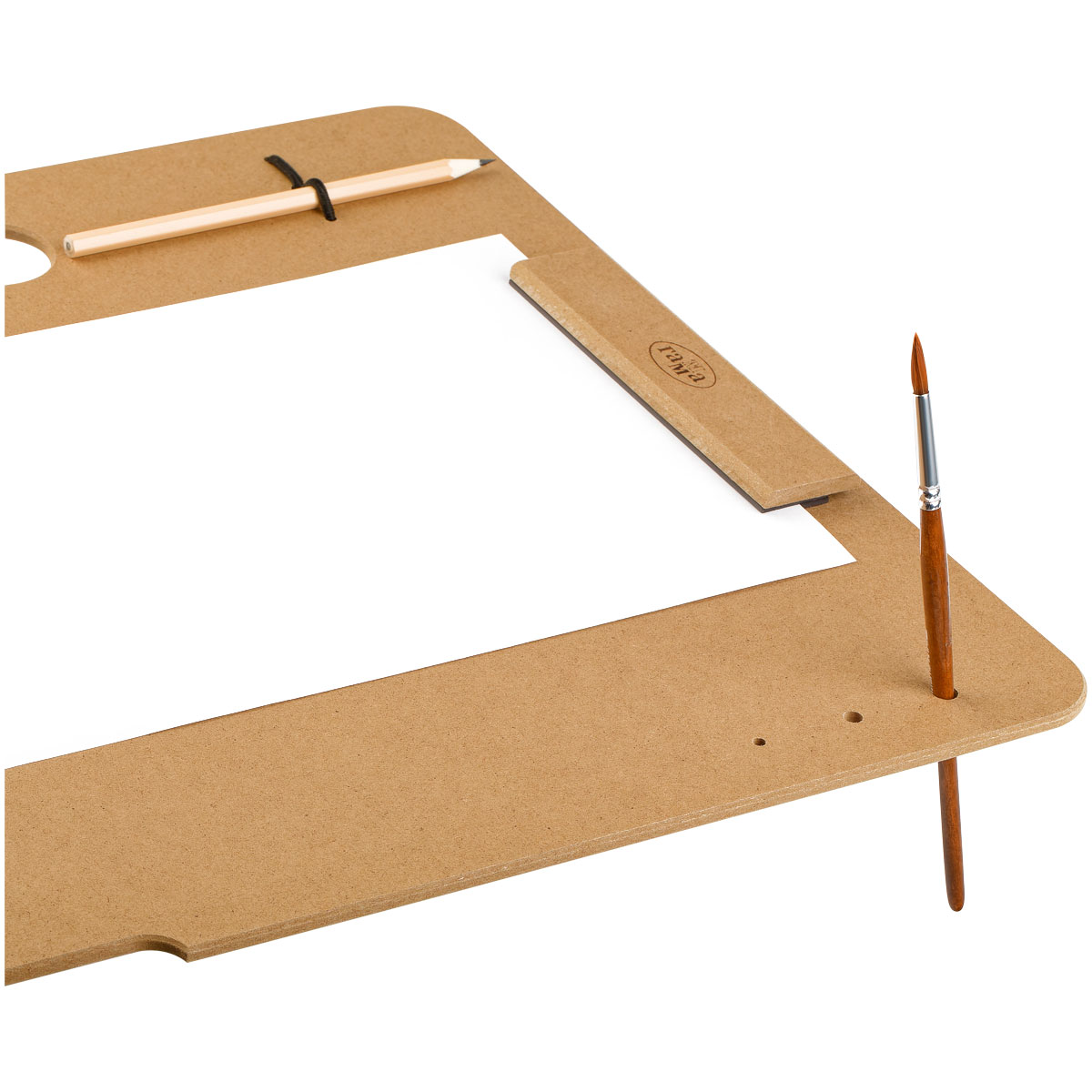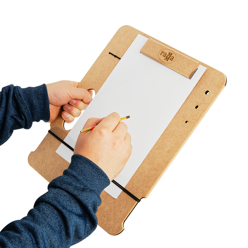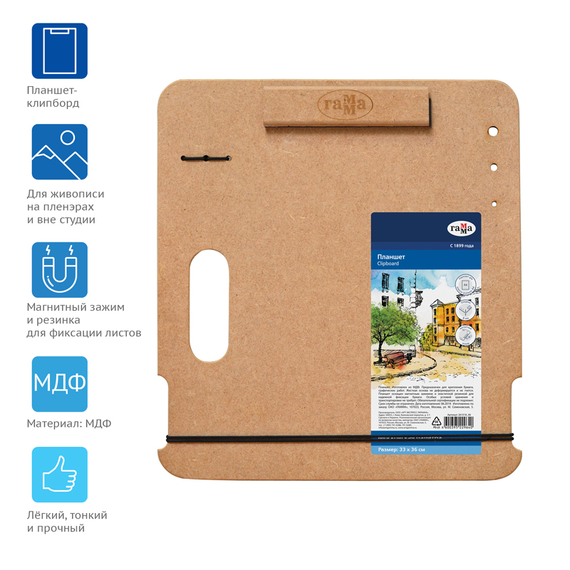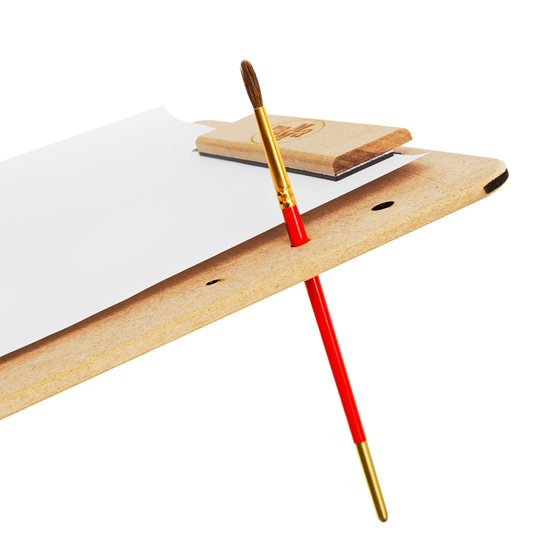 Планшет-клипборд для живописи на пленэрах и вне студии — легкий, тонкий, но прочный. Магнитный зажим и резинка надежно фиксируют лист, не оставляя заломов. Гладкая поверхность не повредит даже тонкую бумагу. Держатели для карандашей и отверстия для кистей позволяют организовать рабочее место. Планшет можно установить на мольберт-треногу или этюдник. Вырубная ручка для удобной транспортировки. Размерный ряд подходит для бумаги форматов бумаги от А4 до А2.