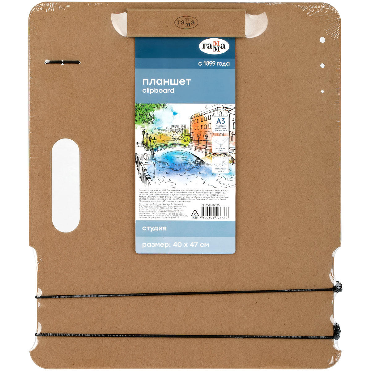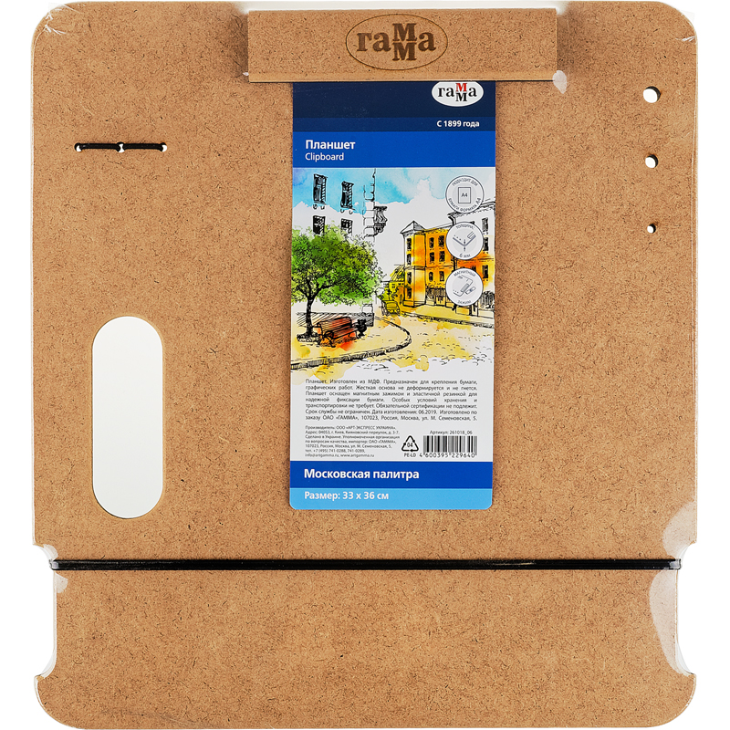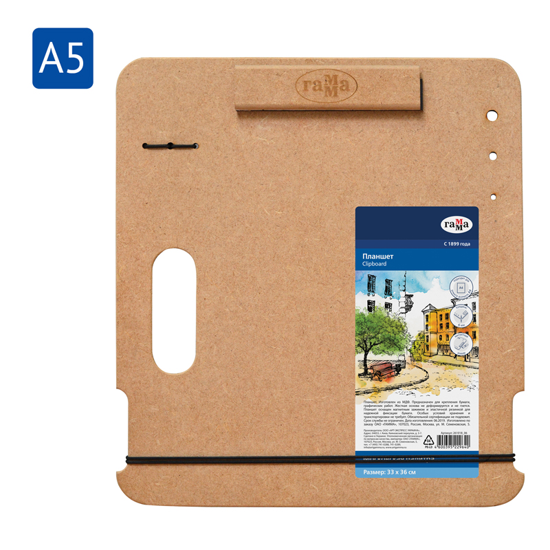 Планшет-клипборд ГАММА серии «Студия» для живописи на пленэрах и вне студии — легкий, тонкий, но прочный. Выполнен в размере 22*35 см и подходит для бумаги формата А4. Изготовлен из МДФ. Магнитный зажим и резинка надежно фиксируют лист, не оставляя заломов. Гладкая поверхность не повредит даже тонкую бумагу. Держатели для карандашей и отверстия для кистей позволяют организовать рабочее место. Планшет можно установить на мольберт-треногу или этюдник. Упакован в термоплёнку. • Материал: МДФ; • Размер: 22*35 см.