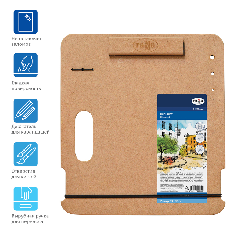 Планшет-клипборд ГАММА серии «Студия» для живописи на пленэрах и вне студии — легкий, тонкий, но прочный. Выполнен в размере 33*36 см и подходит для бумаги формата А4. Изготовлен из МДФ. Магнитный зажим и резинка надежно фиксируют лист, не оставляя заломов. Гладкая поверхность не повредит даже тонкую бумагу. Держатели для карандашей и отверстия для кистей позволяют организовать рабочее место. Есть вырубная ручка для удобной транспортировки. Планшет можно установить на мольберт-треногу или этюдник. Упакован в термоплёнку. • Материал: МДФ; • Размер: 33*36 см.