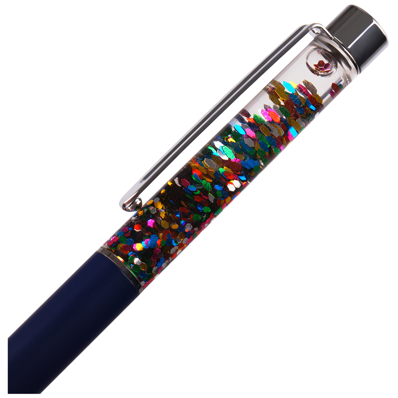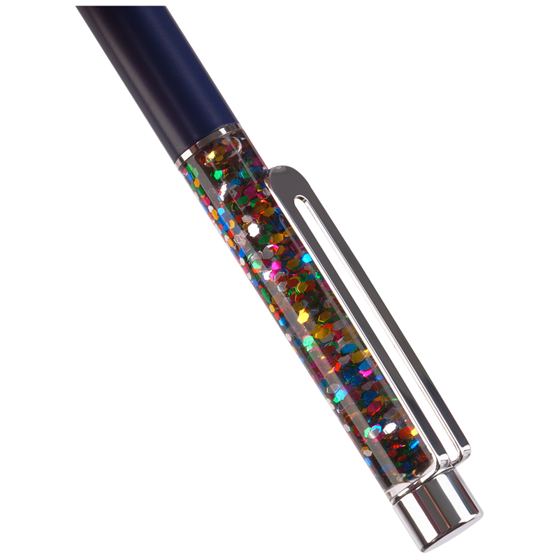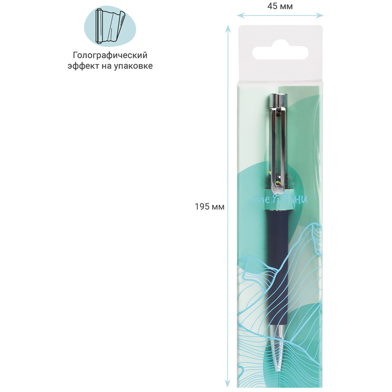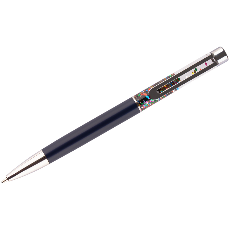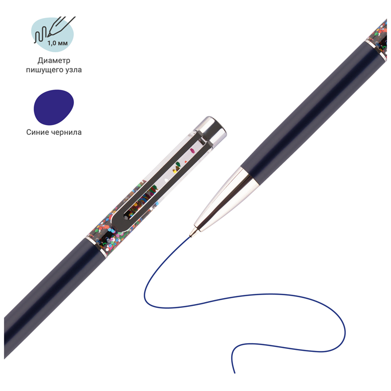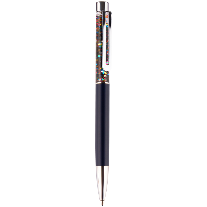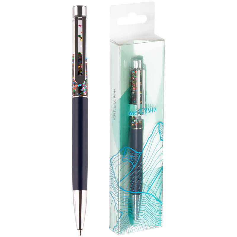 Шариковая ручка MESHU – это привлекательный аксессуар для ярких, смелых и успешных. Диаметр пишущего узла: 1 мм. Ручка подойдёт для мягкого и быстрого письма. Серебряный корпус ручки из металла с темно-синим матовым эффектом украшен вставкой с разноцветным глиттером и дополнен металлическим клипом, с помощью которого ручку можно закрепить на одежде или ежедневнике. Ручка Black sand обязательно принесёт удачу в заключении важных контрактов и торжественных соглашений. Изящные и плавные линии, декоративные детали станут неотъемлемой частью праздничной и радостной атмосферы. Благодаря упаковке с голографическими элементами, ручка может стать приятным подарком. Ручка оснащена поворотным механизмом, что говорит о надёжности и безопасности изделия, Стержень не повредится в сумке и не оставит следов на посторонних предметах. Благодаря чернилам синего цвета ручку можно использовать в работе или учёбе на постоянной основе. • Цвет: синий; • Диаметр пишущего узла: 1 мм; • Форма корпуса: круглая.