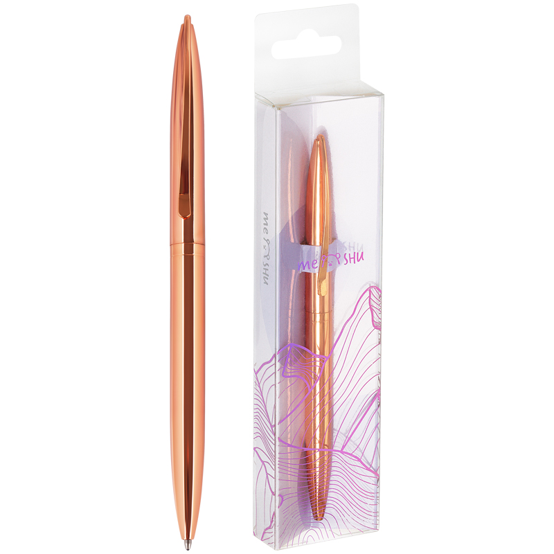 Шариковая ручка MESHU – это привлекательный аксессуар для ярких, смелых и успешных. Лаконичный корпус ручки из металла под розовое золото дополнен металлическим клипом, с помощью которого ручку можно закрепить на одежде или ежедневнике. Ручка Rose gold обязательно принесет удачу в заключении важных контрактов и торжественных соглашений. Изящные и плавные линии, декоративные детали станут неотъемлемой частью праздничной и радостной атмосферы. Благодаря упаковке с голографическими элементами ручка может стать приятным подарком. Диаметр пишущего узла составляет 1 мм, а значит ручка подойдёт для мягкого и быстрого письма. Толщина линии составляет 0,8 мм. Длина сменного стержня 105 мм. Ручка оснащена поворотным механизмом, что говорит о надёжности и безопасности изделия – стержень не повредится в сумке и не оставит следов на посторонних предметах. Благодаря чернилам синего цвета ручку можно использовать в работе или учёбе на постоянной основе.