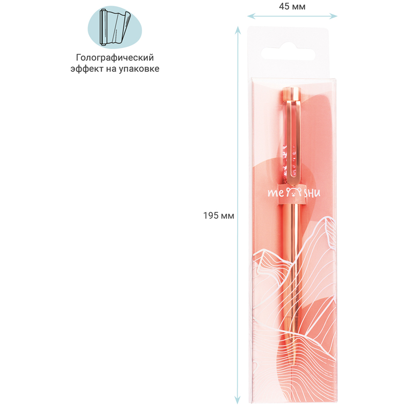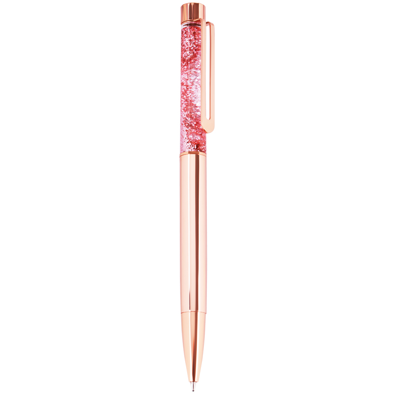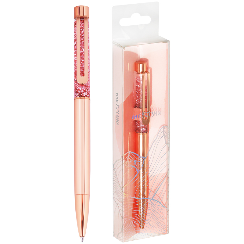 Шариковая ручка MESHU – это привлекательный аксессуар для ярких, смелых и успешных. Корпус ручки из металла под розовое золото украшен вставкой с глиттером и дополнен металлическим клипом, с помощью которого ручку можно закрепить на одежде или ежедневнике. Ручка Rose sand обязательно принесет удачу в заключении важных контрактов и торжественных соглашений. Изящные и плавные линии, декоративные детали станут неотъемлемой частью праздничной и радостной атмосферы. Благодаря упаковке с голографическими элементами ручка может стать приятным подарком. Диаметр пишущего узла составляет 1 мм, а значит ручка подойдёт для мягкого и быстрого письма. Толщина линии составляет 0,8 мм. Длина сменного стержня 142 мм. Ручка оснащена поворотным механизмом, что говорит о надёжности и безопасности изделия – стержень не повредится в сумке и не оставит следов на посторонних предметах. Благодаря чернилам синего цвета ручку можно использовать в работе или учёбе на постоянной основе.