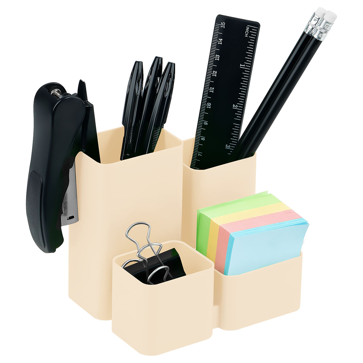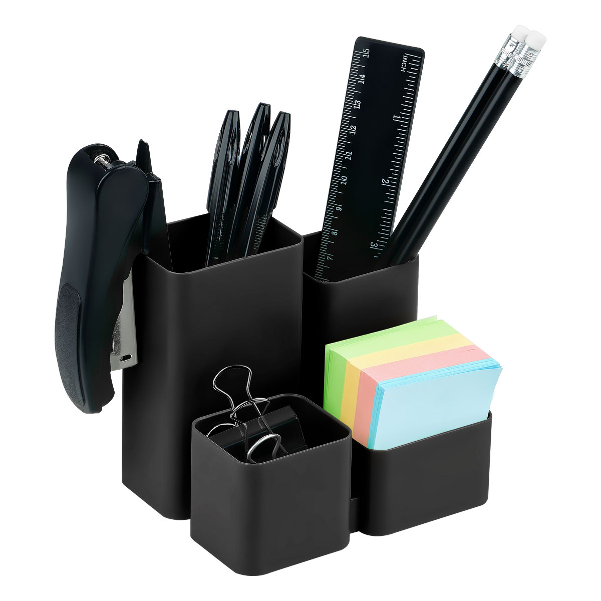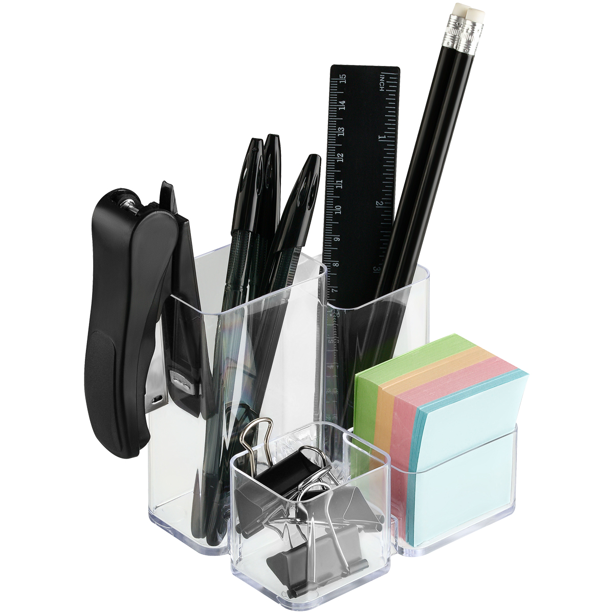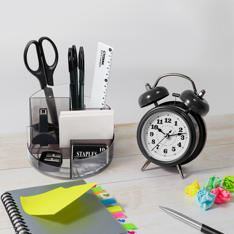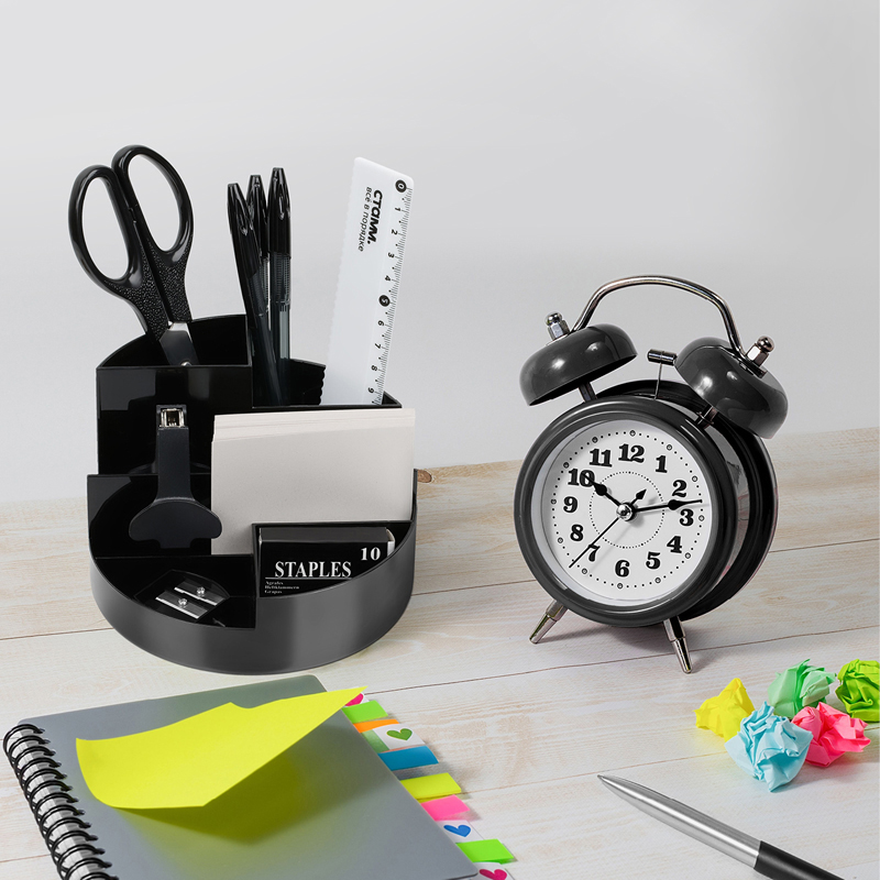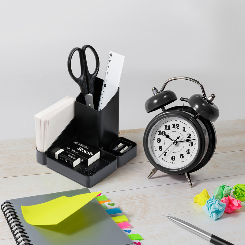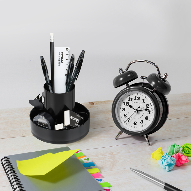 Объемные, удобно расположенные секции разной высоты, гладкая глянцевая поверхность, 6 отделений для канцелярских мелочей и пишущих принадлежностей, визиток и листков для записей. Прочный корпус подставки.