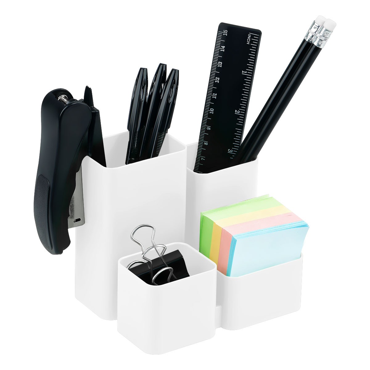 Компактный стильный органайзер для рабочего стола с 4 отделениями для канцелярских принадлежностей. Прочный корпус, гладкая глянцевая поверхность. Высота подставки - 111 мм. Корпус изделия изготовлен из полистирола.