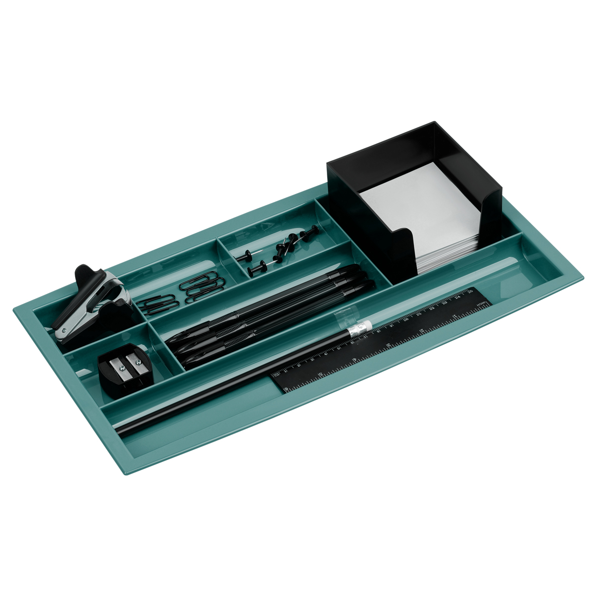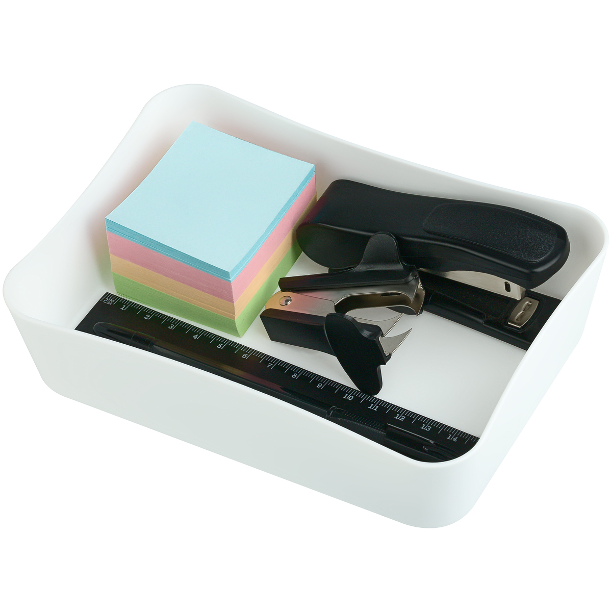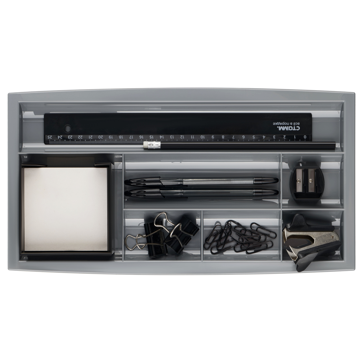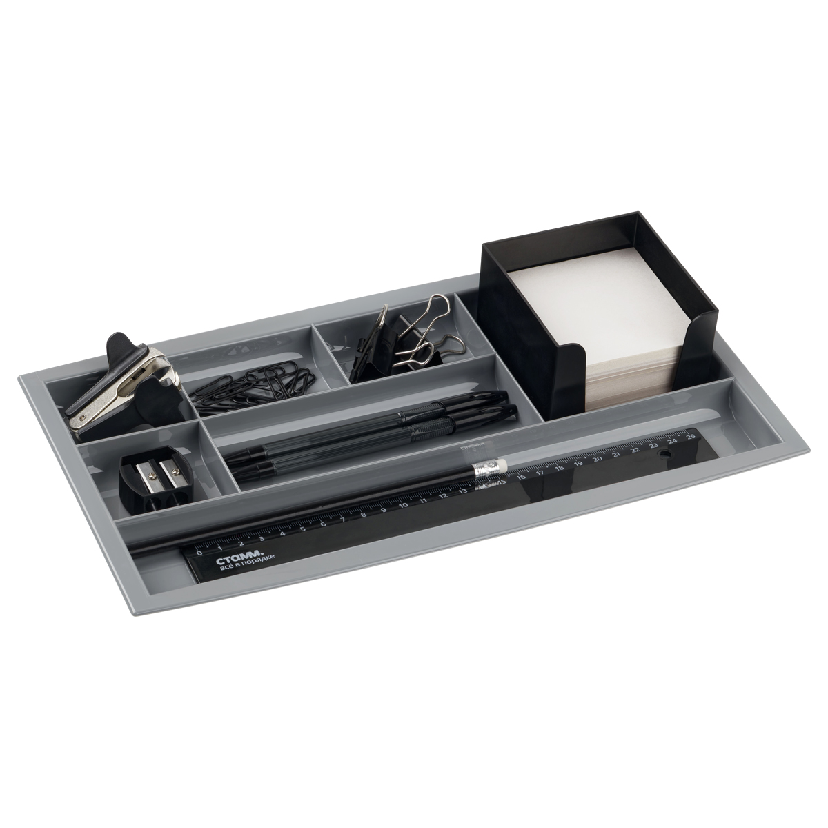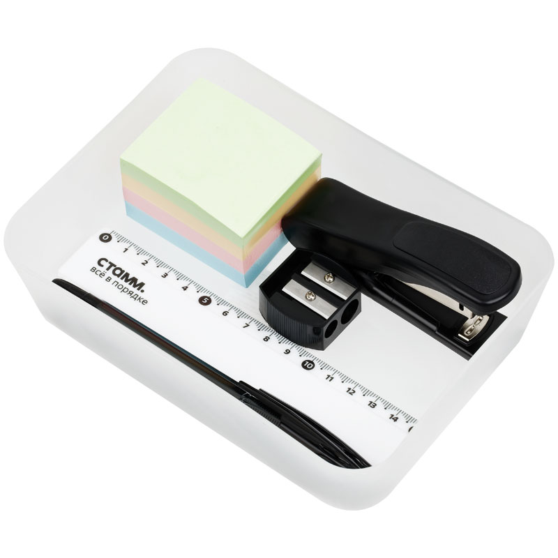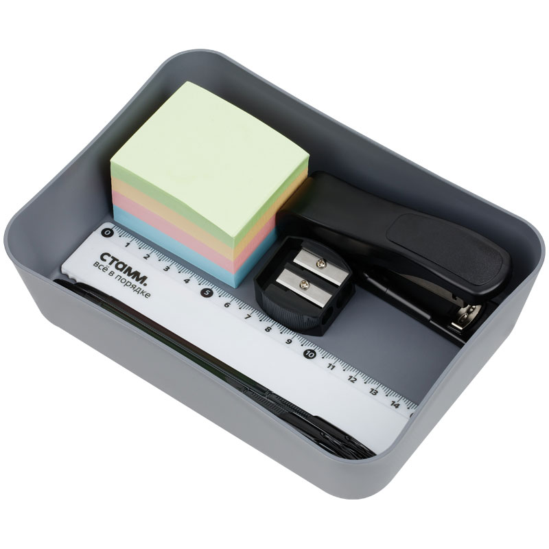 Лоток предназначен для хранения канцелярских принадлежностей. Помогает организовать порядок и легко умещается в ящике рабочего стола.
