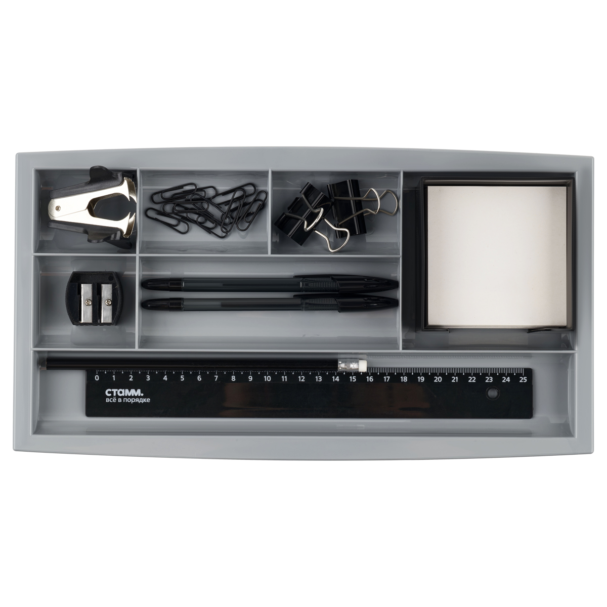 Настольная подставка СТАММ предназначена для хранения канцелярских принадлежностей и бытовых мелочей. Имеет 7 отделений разных размеров. Длина - 351 мм, ширина - 182мм, высота - 20мм. Подходит для размещения в ящике рабочего стола. Цвет - серый. Изделие изготовлено из пластика.