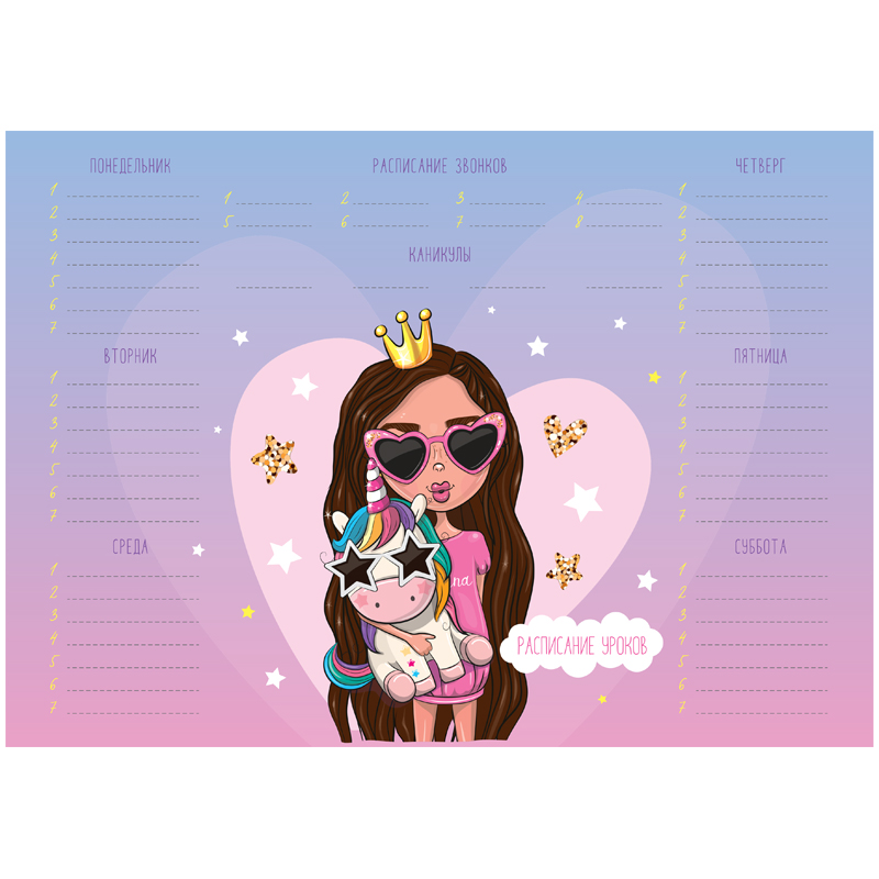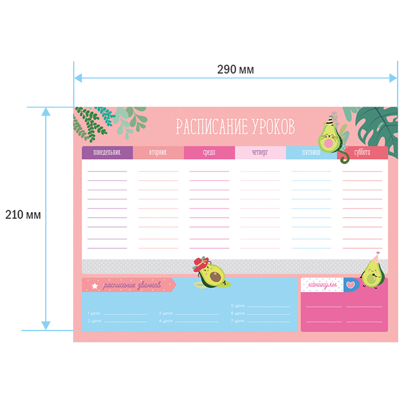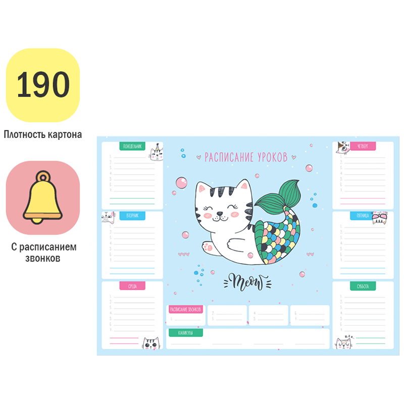 Чтобы правильно составить распорядок дня и рационально распределить время ребенка, необходимо определиться, какие элементы должны быть в нем отражены. Прежде всего это время на учебу в школе и подготовку домашнего задания в домашних условиях. В вопросе школьного планирования идеально подходит расписание уроков ArtSpace. Включает блок "Расписание звонков". Выполнено из плотного картона 190 г/м2 Ассорти из 2 дизайнов (10+10). Транспортная упаковка: гофрокороб или крафт бумага по 600шт.