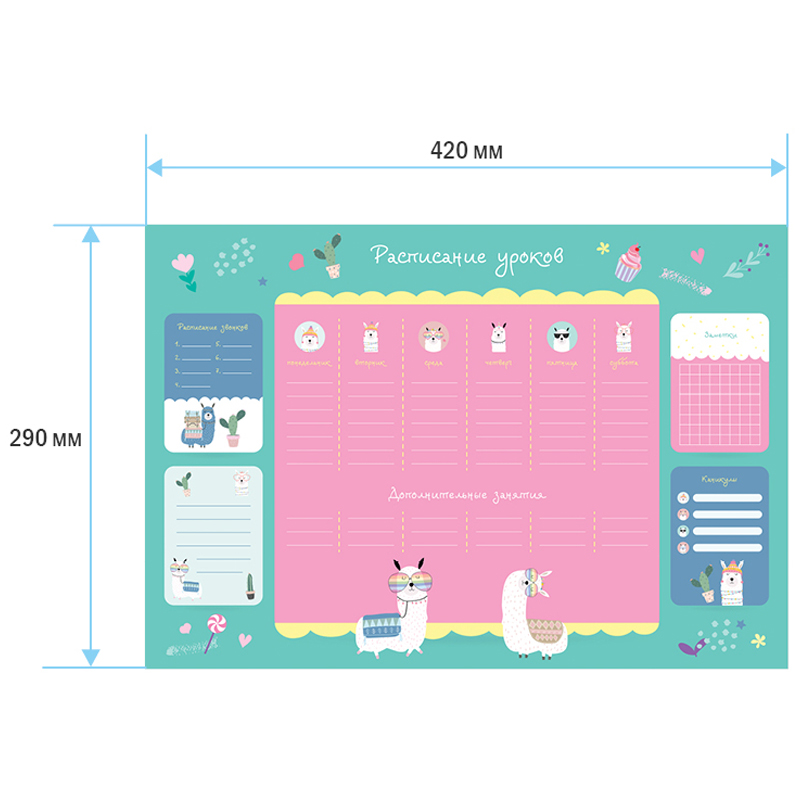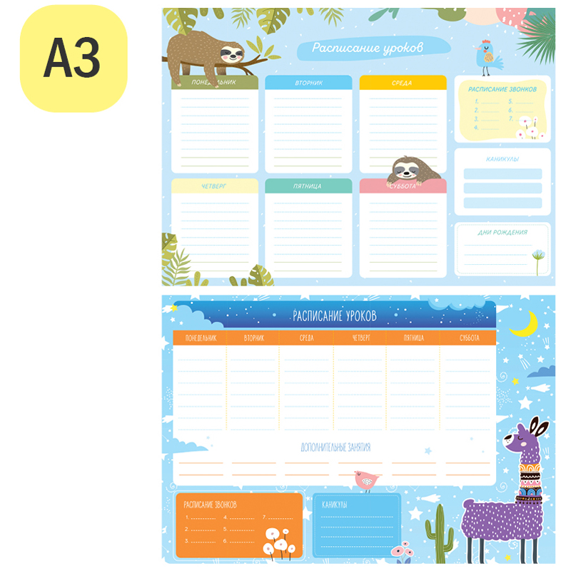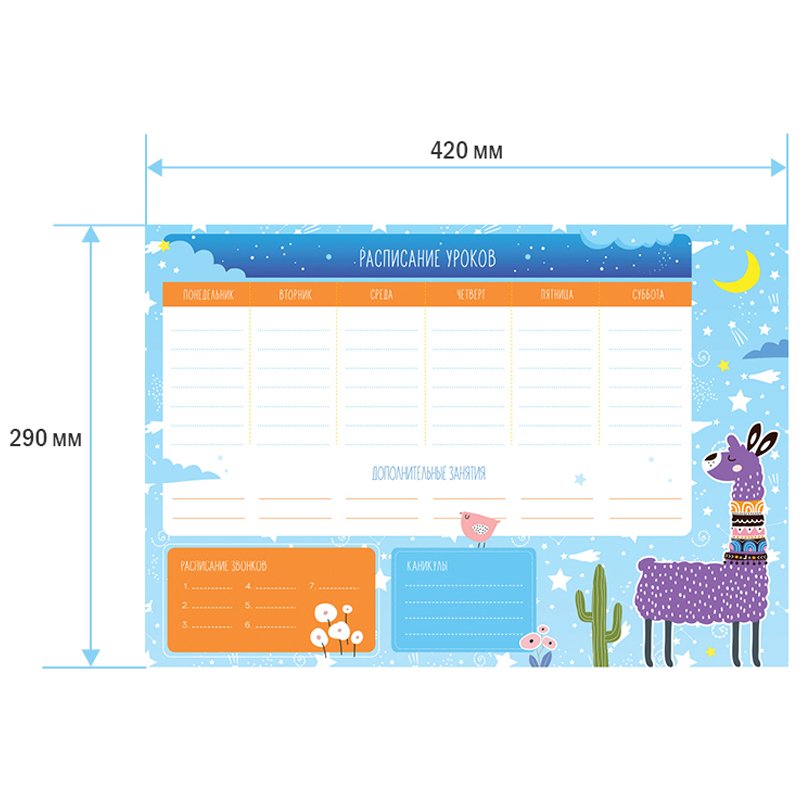 Чтобы правильно составить распорядок дня и рационально распределить время ребенка, необходимо определиться, какие элементы должны быть в нем отражены. Прежде всего это время на учебу в школе и подготовку домашнего задания в домашних условиях. В вопросе школьного планирования идеально подходит расписание уроков ArtSpace. Включает блок "Расписание звонков". Выполнено из плотного картона 190 г/м2 Ассорти из 2 дизайнов (10+10). Транспортная упаковка: гофрокороб или крафт бумага по 400шт.