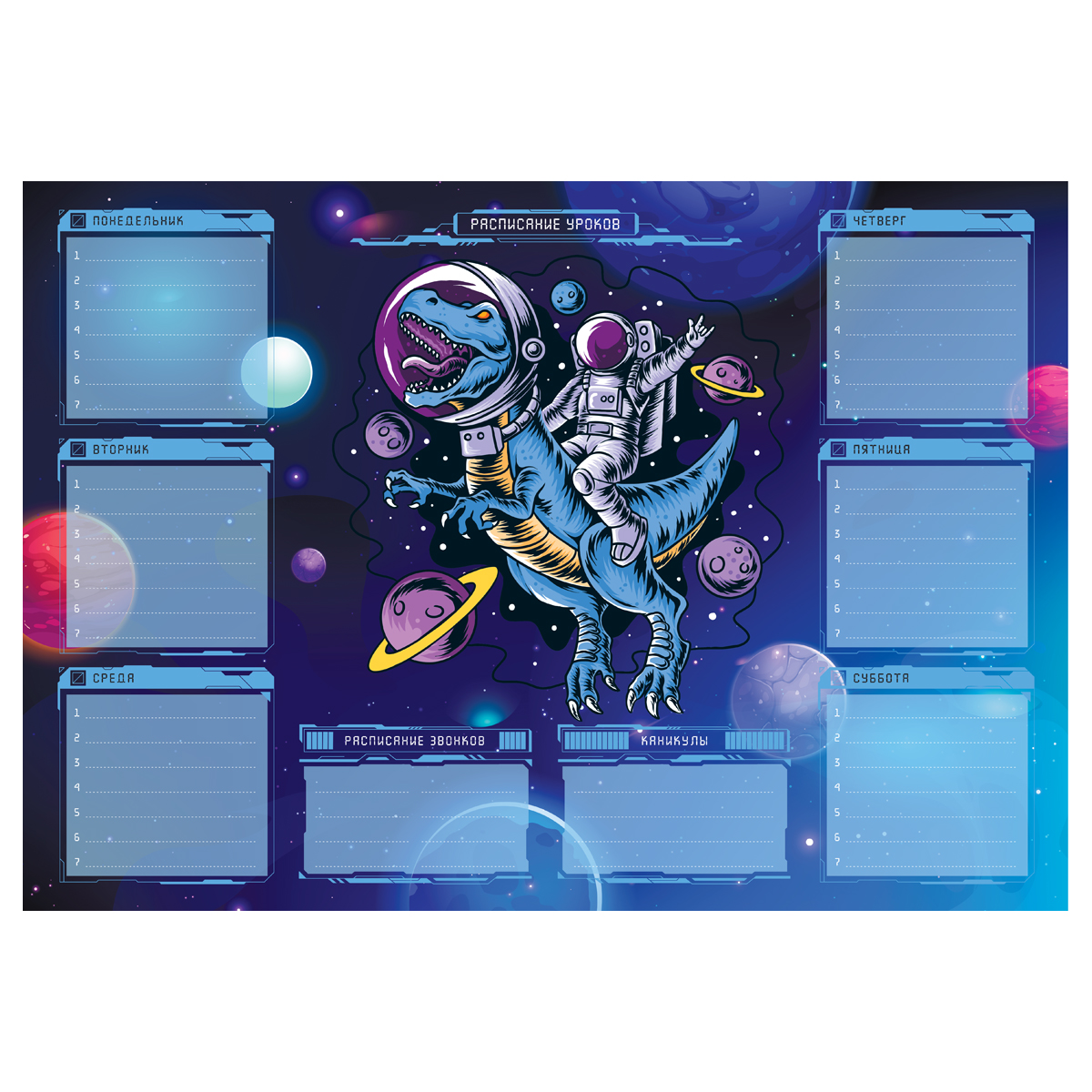 Чтобы правильно составить распорядок дня и рационально распределить время ребенка, необходимо определиться, какие элементы должны быть в нем отражены. Прежде всего это время на учебу в школе и подготовку домашнего задания в домашних условиях. В вопросе школьного планирования идеально подходит расписание уроков ArtSpace. Включает блок "Расписание звонков". Выполнено из плотного картона 190 г/м2 Ассорти из 2 дизайнов (10+10). Транспортная упаковка: гофрокороб или крафт бумага.