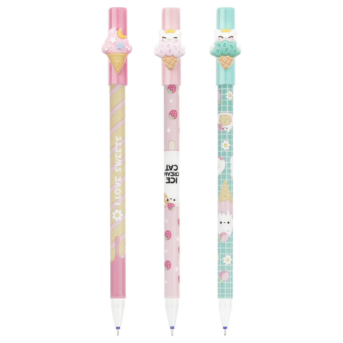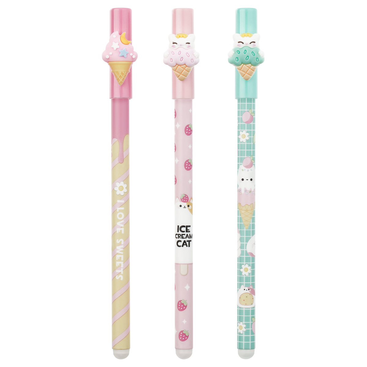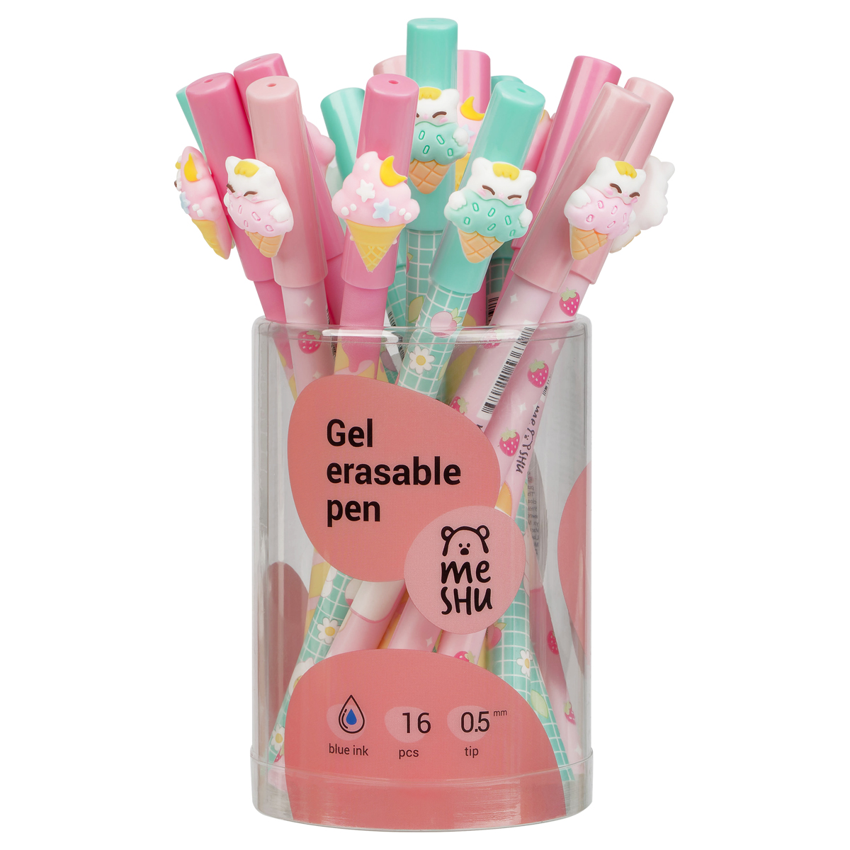 Гелевая стираемая ручка Meshu "Ice cream" станет ярким атрибутом отличного настроения на работе или учёбе. Изделие обладает необычным дизайном. Гелевые чернила не только ярко пишут на бумаге, но и при воздействии температуры становятся невидимыми – достаточно потереть написанное специальным ластиком на кончике ручки. Обесцвеченные чернила проявляются при низкой температуре. Диаметр пишущего узла составляет 0,5 мм, благодаря чему ручка прекрасно подойдёт для любого стиля письма. Толщина линии составляет 0,3 мм. Благодаря чернилам синего цвета ручку можно использовать в работе или учёбе на постоянной основе. • Цвет чернил: синий; • Толщина линии письма: 0,3 мм; • Цвет корпуса: ассорти; • Количество штук в упаковке: 16.