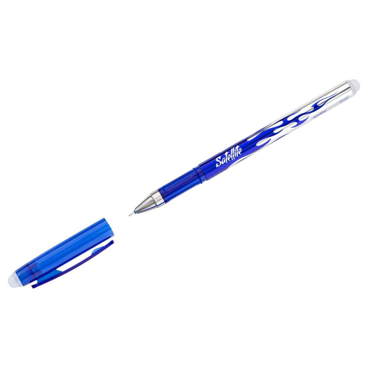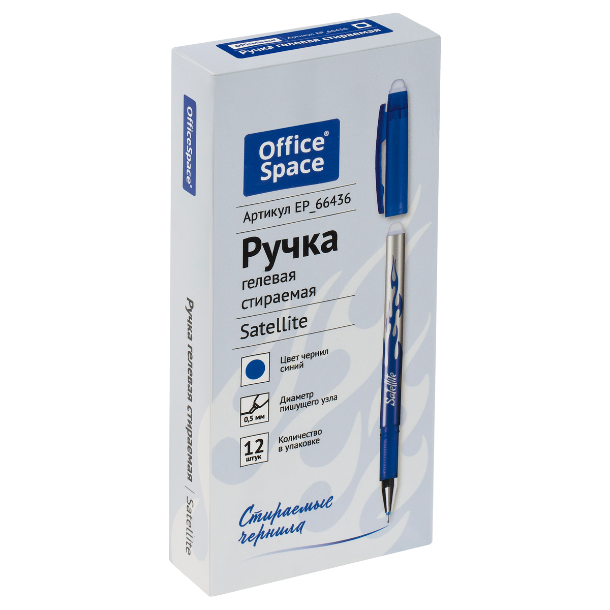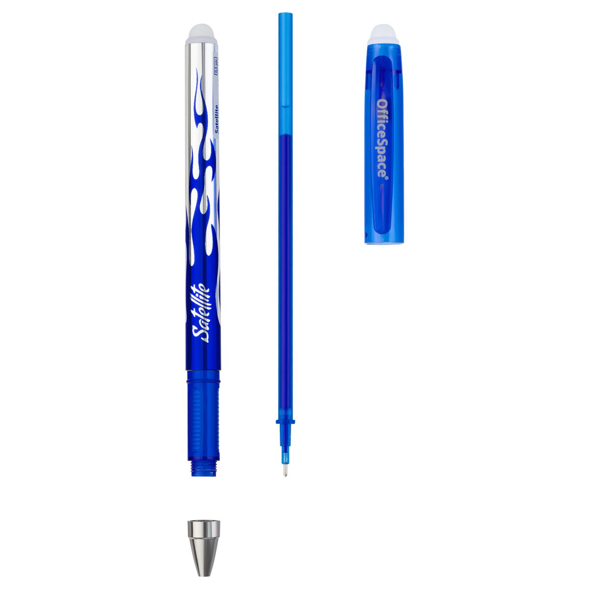 Гелевая ручка OfficeSpace Satellite– это незаменимый помощник в учебе, работе и творчестве. Гелевые чернила не только ярко пишут на бумаге, но и при воздействии температуры становятся невидимыми – достаточно потереть написанное ластиком на кончике ручки. Обесцвеченные чернила проявляются при низкой температуре. Есть колпачок с клипом – можно закрепить ручку на одежде или тетради. Диаметр пишущего узла 0,5 мм, благодаря чему получается тонкая и аккуратная линия. • Цвет чернил: синий; • Толщина линии письма: 0,3 мм; • Длина письма: 150 метров; • Цвет корпуса: синий; • Длина сменного стержня: 130 мм; • Упаковка: картонная коробка.