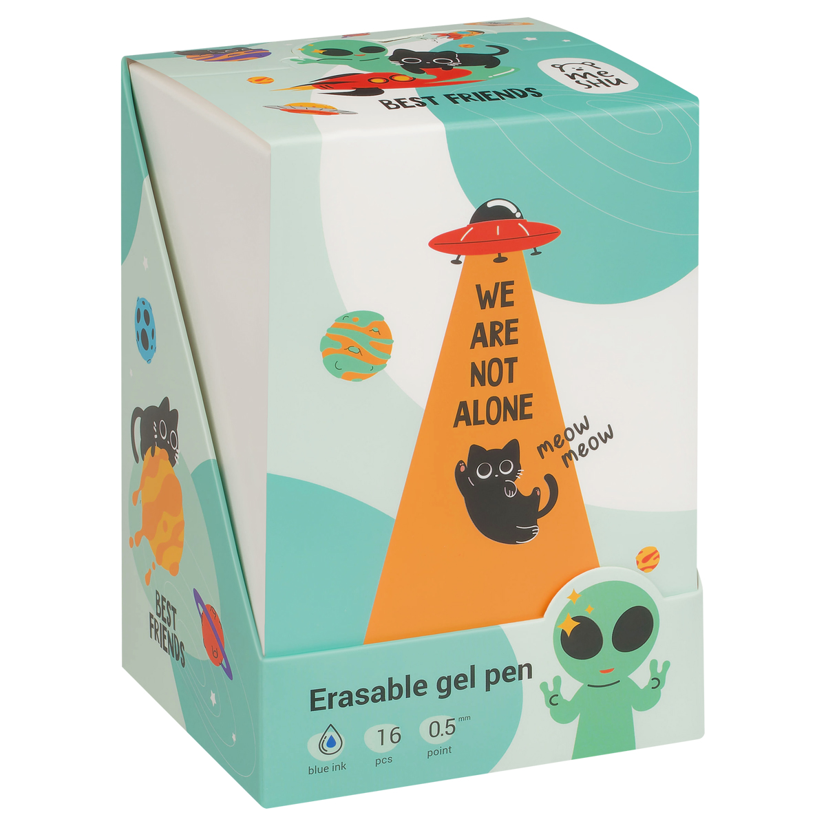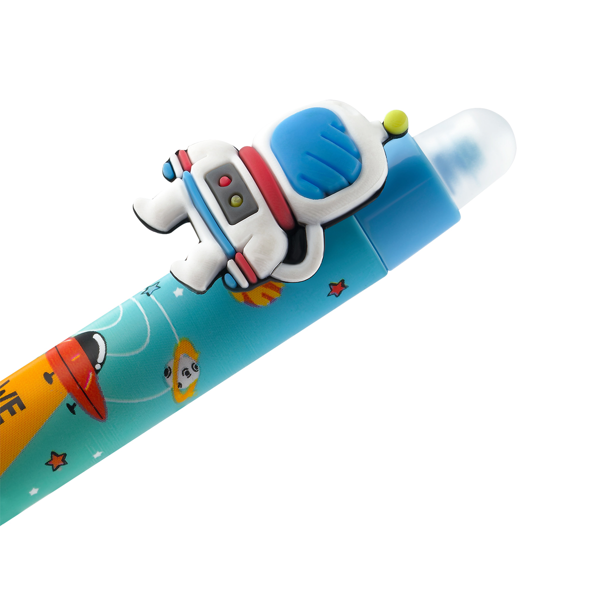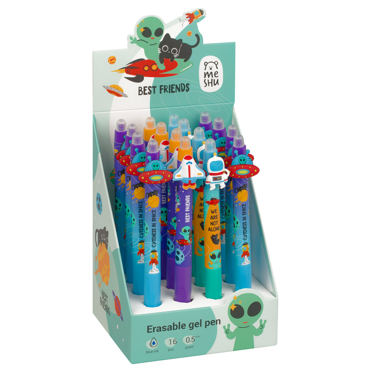 Гелевая стираемая ручка Meshu "Space adventure" станет ярким атрибутом отличного настроения на работе или учёбе. Изделие обладает необычным дизайном. Гелевые чернила не только ярко пишут на бумаге, но и при воздействии температуры становятся невидимыми – достаточно потереть написанное специальным ластиком на кончике ручки. Обесцвеченные чернила проявляются при низкой температуре. Диаметр пишущего узла составляет 0,5 мм, благодаря чему ручка прекрасно подойдёт для любого стиля письма. Толщина линии составляет 0,3 мм. Благодаря чернилам синего цвета ручку можно использовать в работе или учёбе на постоянной основе. • Цвет чернил: синий; • Толщина линии письма: 0,3 мм; • Цвет корпуса: ассорти; • Количество штук в упаковке: 16