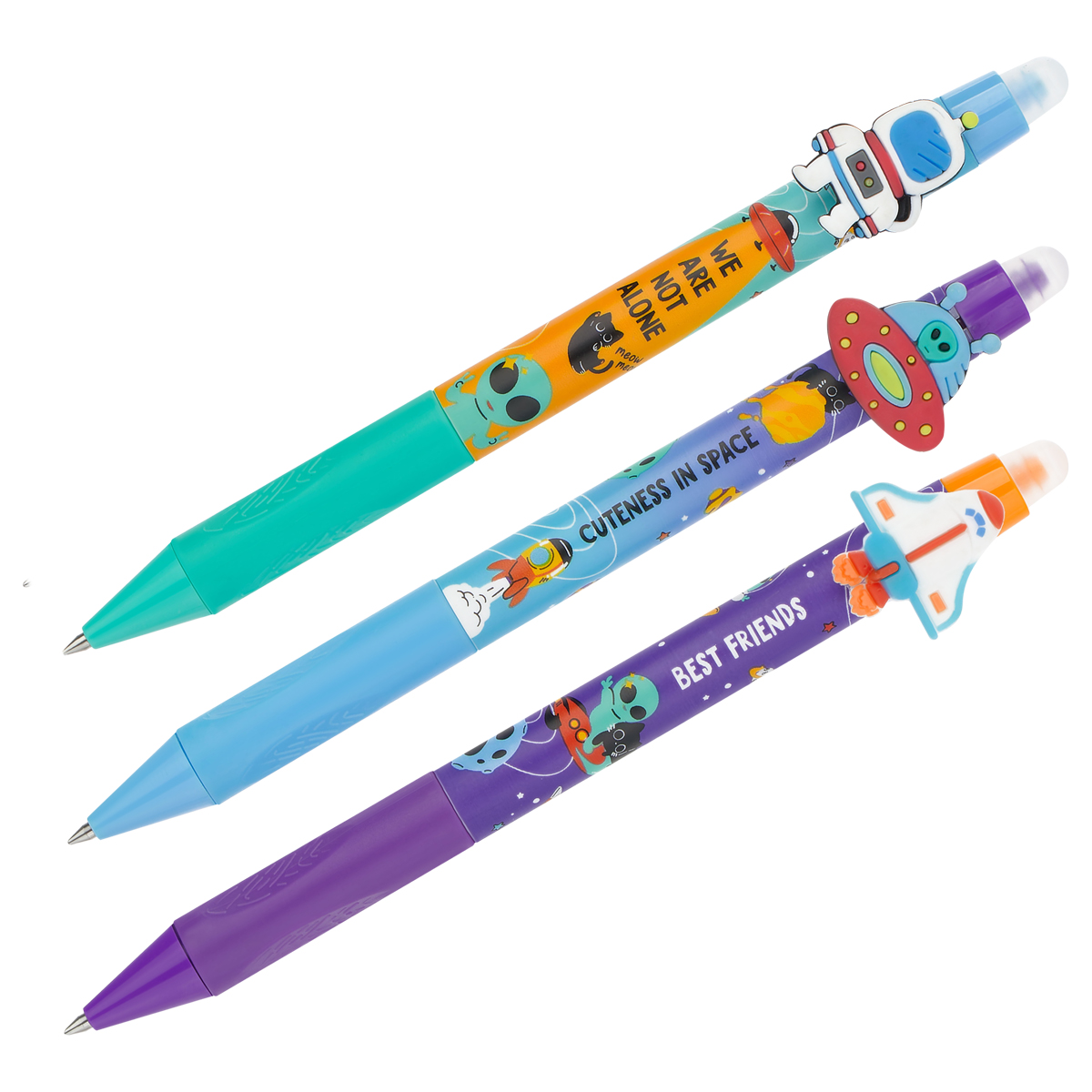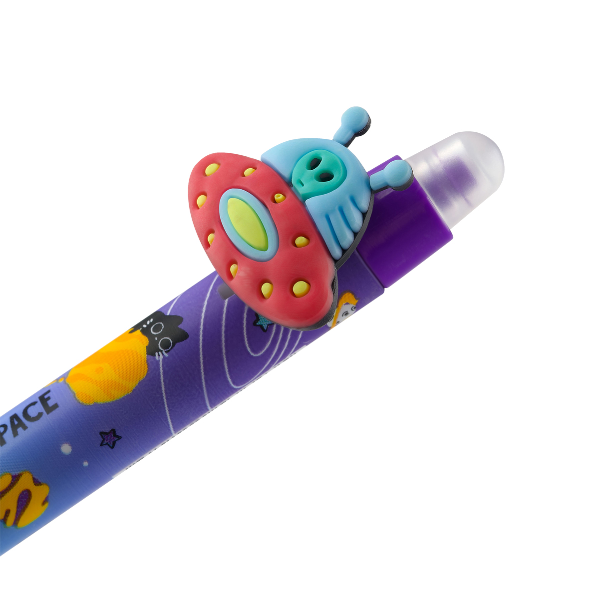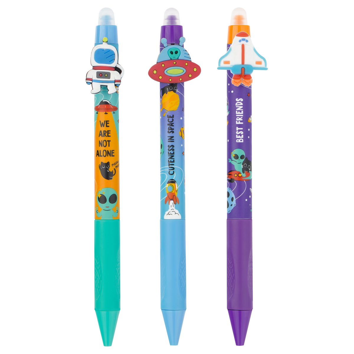 Гелевая стираемая ручка Meshu "Space adventure" станет ярким атрибутом отличного настроения на работе или учёбе. Изделие обладает необычным дизайном. Гелевые чернила не только ярко пишут на бумаге, но и при воздействии температуры становятся невидимыми – достаточно потереть написанное специальным ластиком на кончике ручки. Обесцвеченные чернила проявляются при низкой температуре. Диаметр пишущего узла составляет 0,5 мм, благодаря чему ручка прекрасно подойдёт для любого стиля письма. Толщина линии составляет 0,3 мм. Благодаря чернилам синего цвета ручку можно использовать в работе или учёбе на постоянной основе. • Цвет чернил: синий; • Толщина линии письма: 0,3 мм; • Цвет корпуса: ассорти; • Количество штук в упаковке: 16