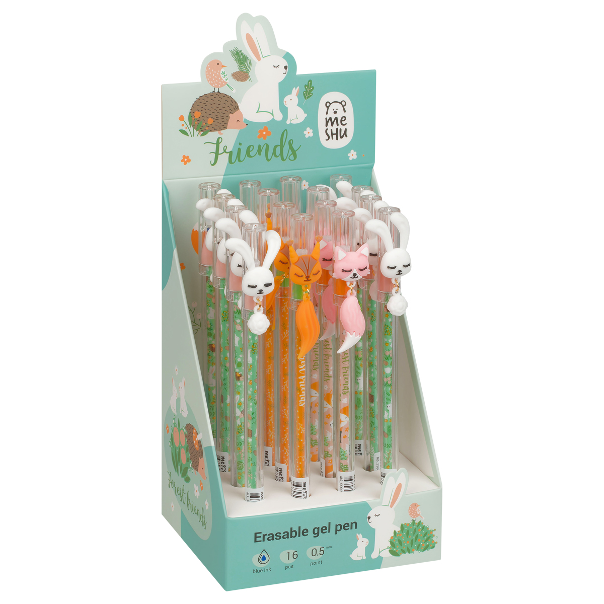 Гелевая стираемая ручка Meshu "Funny friends" станет ярким атрибутом отличного настроения на работе или учёбе. Изделие обладает необычным дизайном. Гелевые чернила не только ярко пишут на бумаге, но и при воздействии температуры становятся невидимыми – достаточно потереть написанное специальным ластиком на кончике ручки. Обесцвеченные чернила проявляются при низкой температуре. Диаметр пишущего узла составляет 0,5 мм, благодаря чему ручка прекрасно подойдёт для любого стиля письма. Толщина линии составляет 0,3 мм. Благодаря чернилам синего цвета ручку можно использовать в работе или учёбе на постоянной основе. • Цвет чернил: синий; • Толщина линии письма: 0,3 мм; • Цвет корпуса: ассорти; • Количество штук в упаковке: 16.